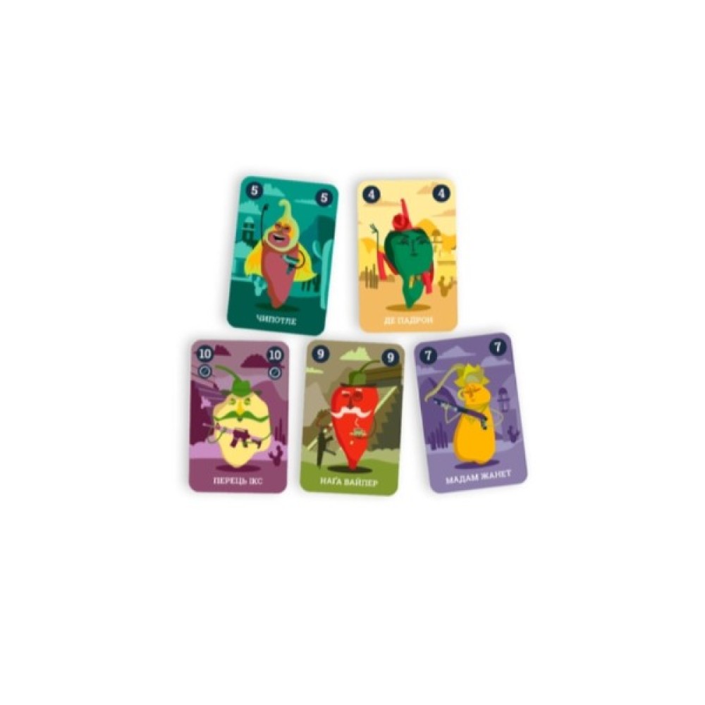 Усередині ви знайдете 38 карт нових крутих перців, серед яких фігурують справжні легенди: Де Патрон, Чипотле, Мадам Жанет, Наґа Вайпер та екзотичний Перець Ікс. Ці герої не залишать байдужими не лише дітей, а й дорослих, завдяки своїм унікальним здібностям.