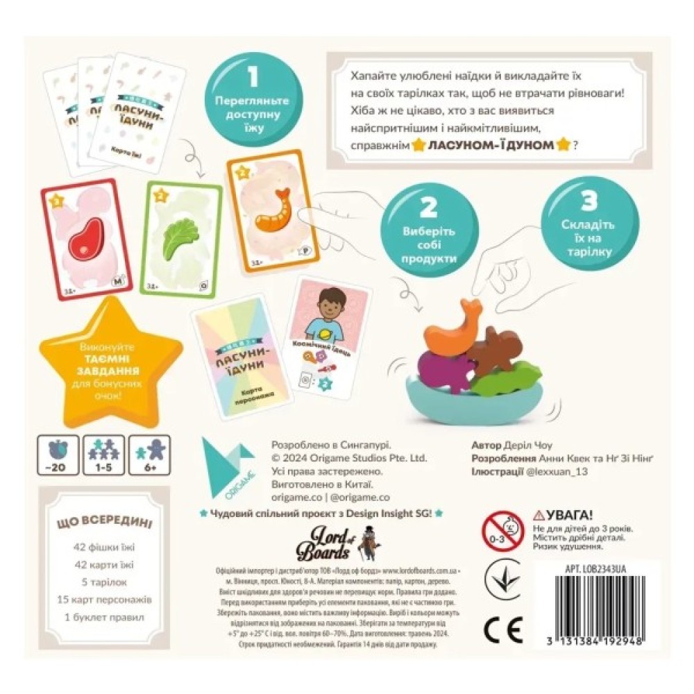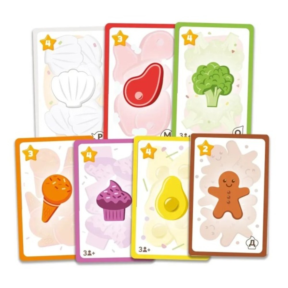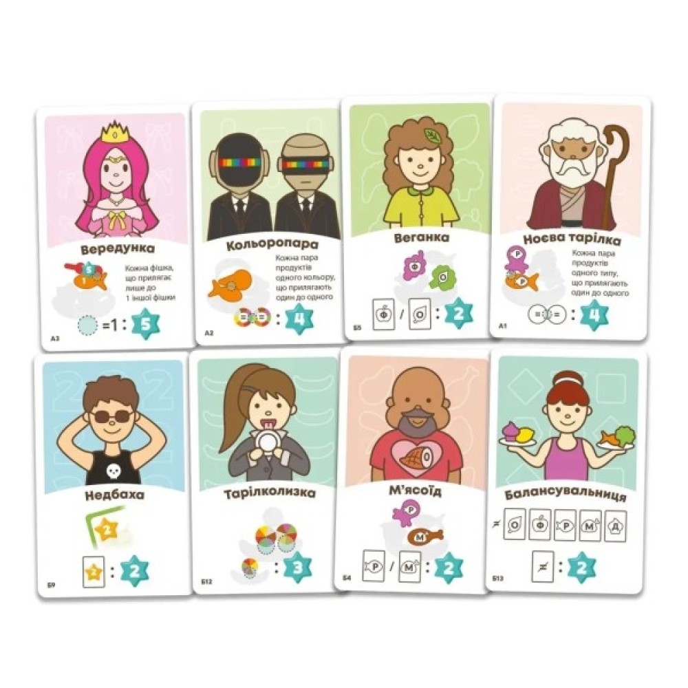 Комплектація гри багатогранна: до набору входять 42 фішки їжі, 5 тарілок, 5 карт меню, 42 карти їжі, 15 карт персонажів та 3 промокарти. Правила гри, зручні для вивчення, викладені українською мовою, що робить її доступнішою для українських гравців.