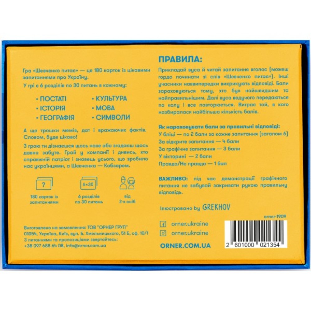Настільна гра Orner "Шевченко питає. Гра про Україну" (1909) створена для того, щоб об'єднати сім'ю, друзів чи колег навколо багатої історії та культури України. Ця стратегічна й навчальна гра запрошує вас дізнатися про видатних людей, події та символи нашої країни, ставлячи запитання у форматі вікторини. Призначена для компаній від двох до семи осіб, гра дарує чудову можливість змагатися, добиваючись знань і веселощів водночас.
