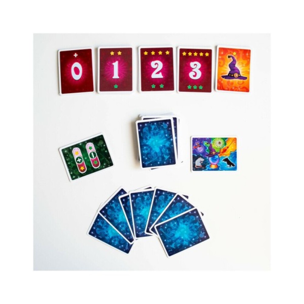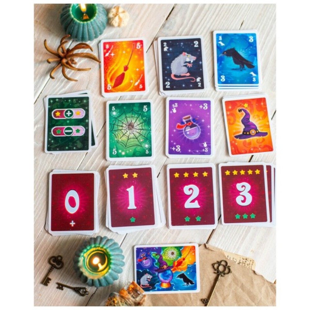 Гра поєднує в собі 45 гральних карт та 44 карти «Чаклунство», які додають інтриги та непередбачуваності. Використовуйте 7 чарівних карт «Капелюх відьми» та 5 карт «Бали» для підсилення своїх стратегій. Але найголовніше — карта «Магічна куля», за допомогою якої ви будете передбачати переможця кожного раунду.