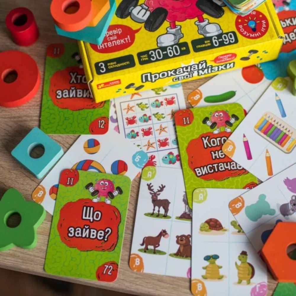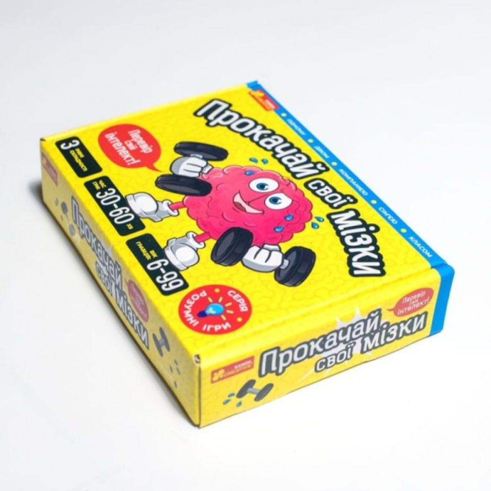 Настільна гра «Прокачай свої мізки» від Ранок стане бездоганним вибором для сімейних вечорів та зустрічей з друзями. Це розвиваюча гра, яка не лише захоплює, але й перевіряє інтелект гравців, пропонуючи три рівні складності для різних вікових груп: I рівень для дітей від 6-7 років, II рівень – 8-9 років, і III рівень – для гравців від 10 років і старших.