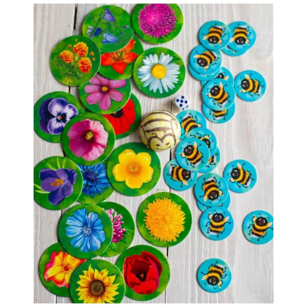 велика бджілка (для великих пальчиків); маленька бджілка (для маленьких пальчиків); 20 великих фішок; 20 маленьких фішок; бджолине гніздо; кубик; правила гри