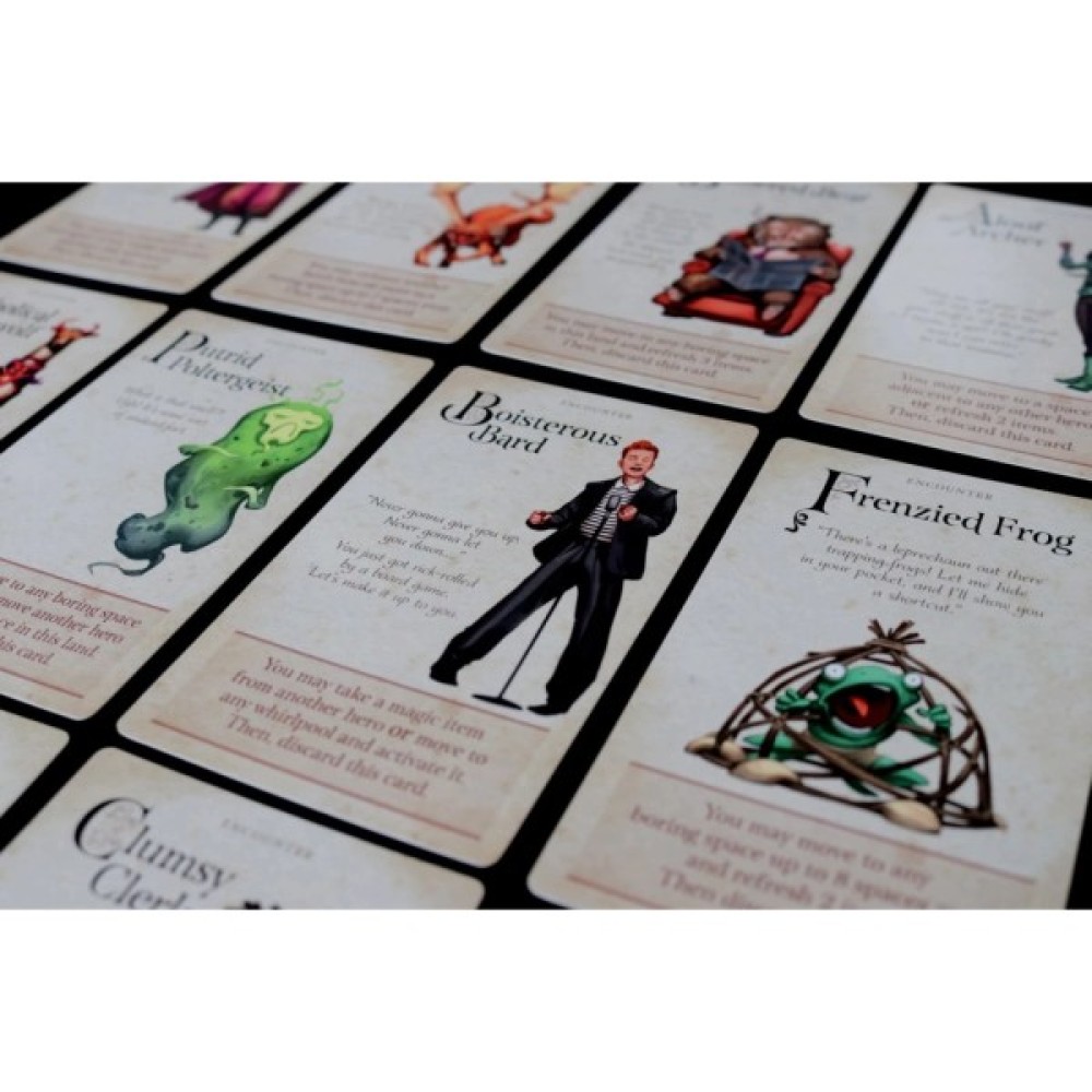 Комплектація гри вражає різноманітністю: дві магічні ігрові дошки, детально розроблені фігури героїв та інші ключові компоненти, включаючи картки подій і жетони магічних предметів, які дозволяють втручатися у результати кидання кубиків, мінімізуючи випадковості.