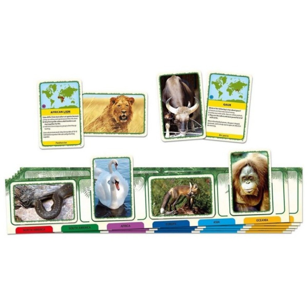 У комплекті ви знайдете 200 карток із детальною інформацією про різноманітних тварин, 6 дощок із континентами, де треба розміщувати картки, карту світу для зручної навігації та правили гри, що дозволяють обрати як простішу, так і більш складну версію.