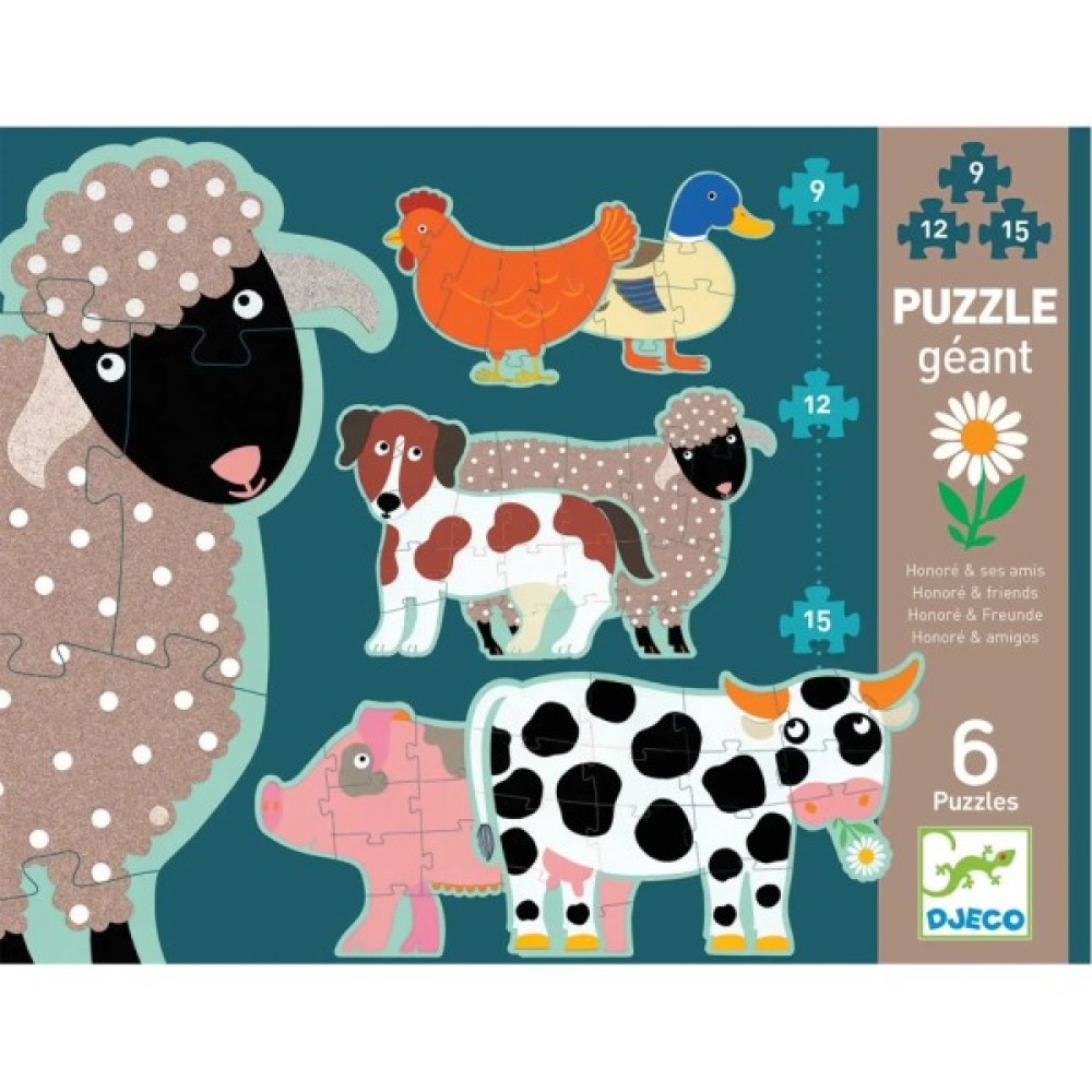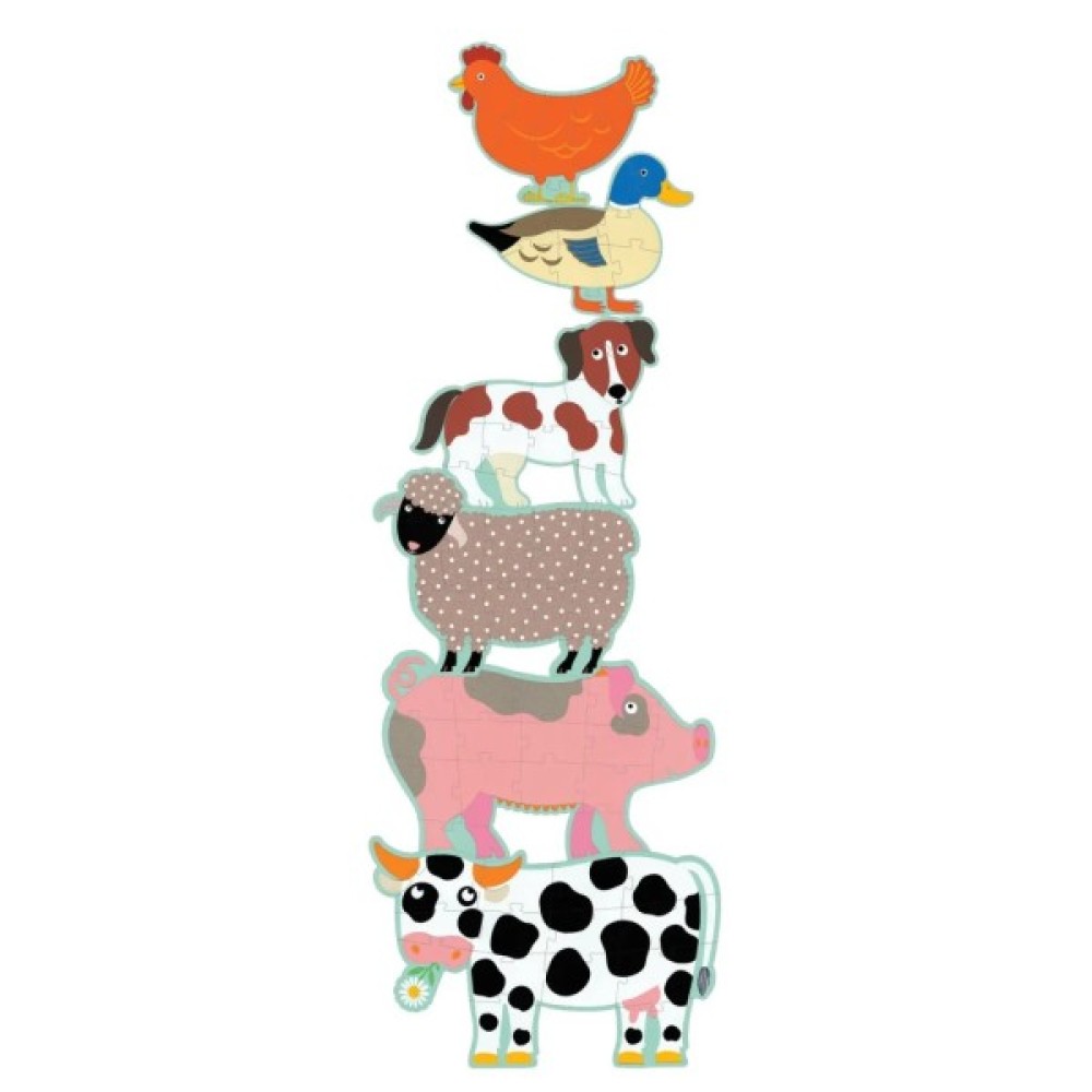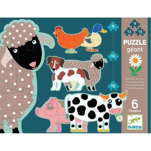 Пазл для збирання 6 фігурок тваринок має деталі великого розміру: 2 пазла з 9 елементів (курка і качка) — 2 пазла з 12 елементів (собака і вівця) — 2 пазла по 15 елементів (корова і свиня). Висота пазла 1,4 м.