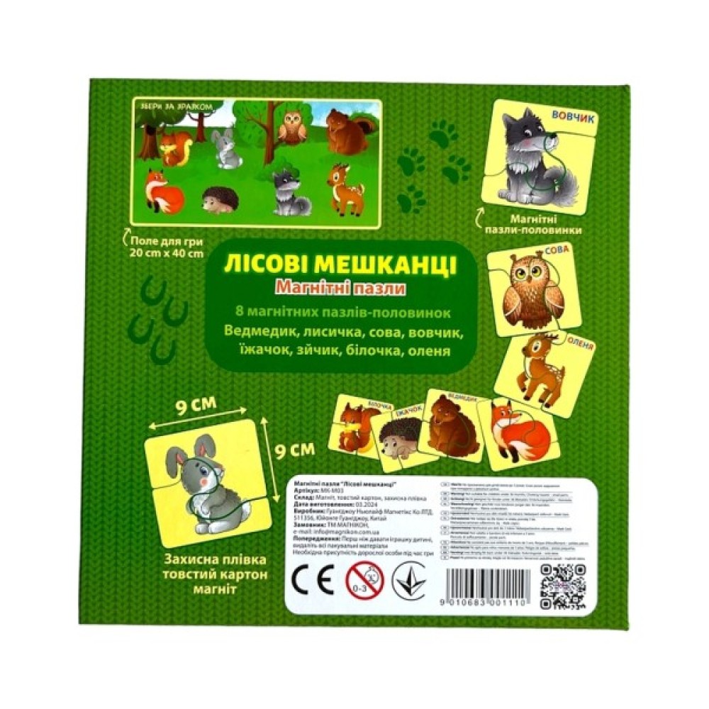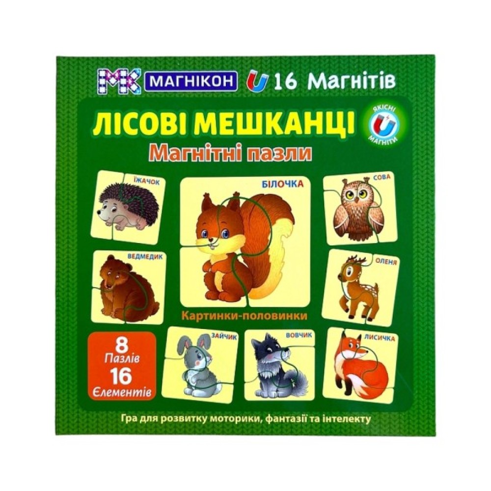 Відкрийте світ захоплюючої гри з магнітними пазлами "Магнікон: Лісові мешканці"! Цей набір допомагає розвивати моторику, уяву та інтелект вашої дитини. Пазли виготовлені з якісних матеріалів: міцного картону з захисною плівкою та надійних магнітів.