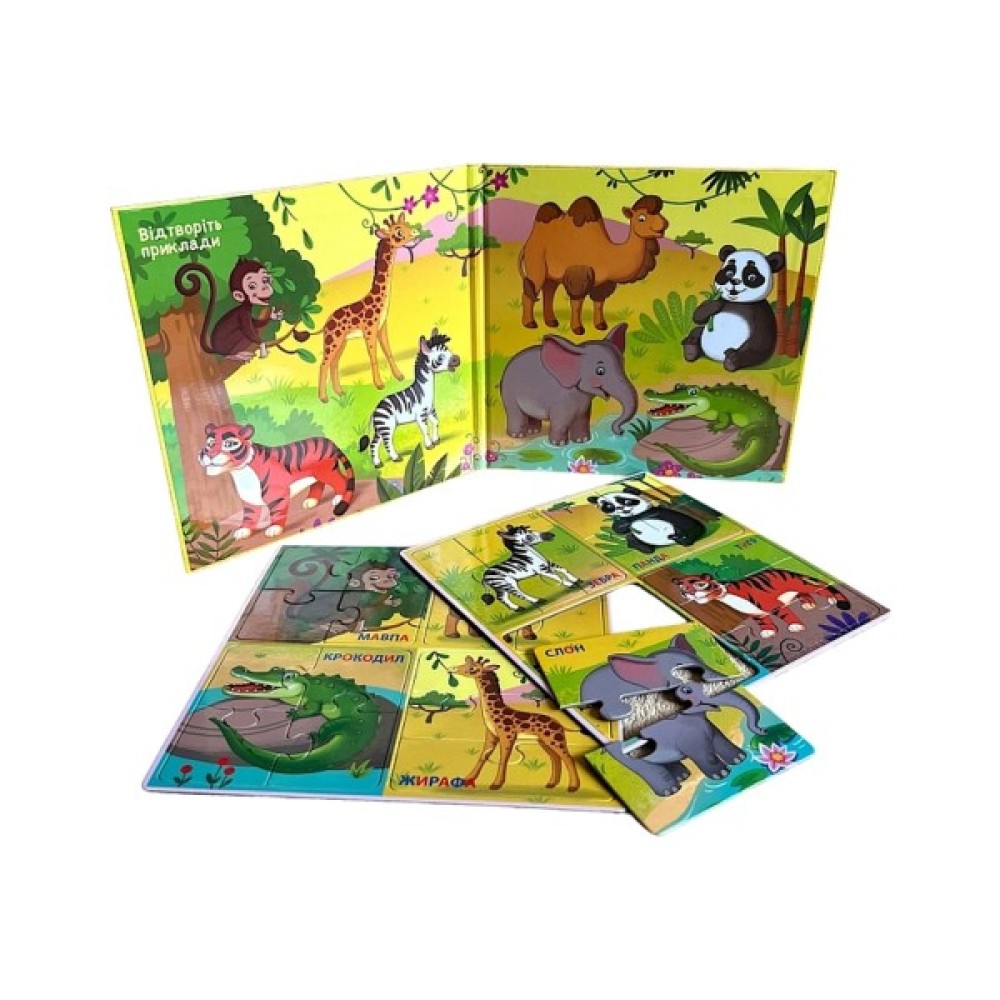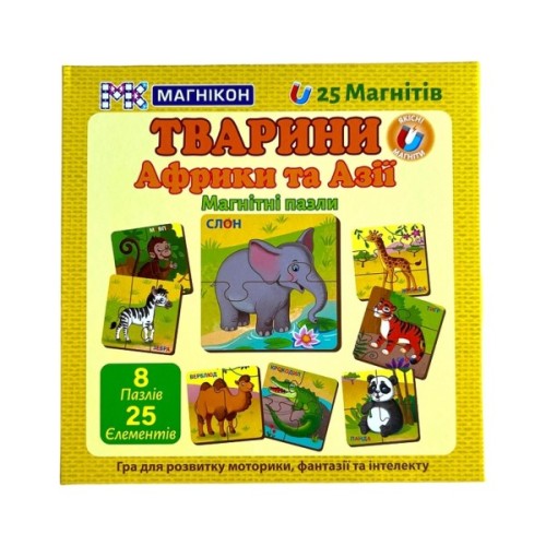 У комплекті 8 магнітних пазлів-половинок, що зображують тварин Африки та Азії: Мавпа, Верблюд, Крокодил, Жирафа, Зебра, Слон, Панда, Тигр. Пазли можна складати від легкого до складного рівня, що дозволяє поступово розвивати логіку та увагу.
