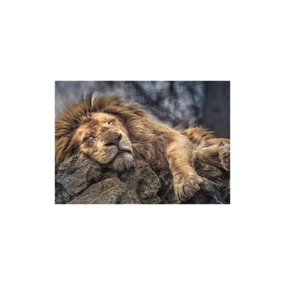 Пазли на 1000 елементів із зображенням лева, який мирно спить на каменях. У складеному вигляді розмір картинки складає 68х48 див. Висока якість, насиченість кольорів і безпеку при складанні пазлів забезпечує спеціальний каландрировані картон, який відбиває світло і покритий екологічними фарбами.