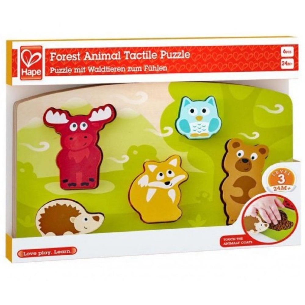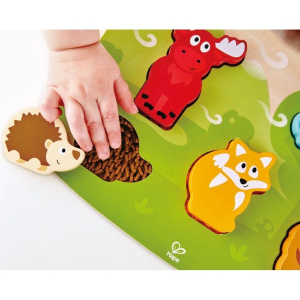 Пазл тактильний Hape Лісові тварини. Пазли — це іграшка, яка сприяє розвитку дитини, але це також чудовий засіб для спільного сімейного дозвілля з вашою дитиною. Чудовий пазл для вивчення тварин. Тактильний пазл Лісові тварини не тільки знайомить із лісовими мешканцями, а й навчає, які вони на дотик.