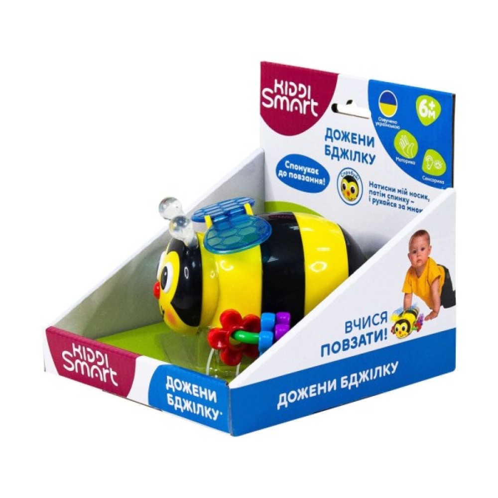 Нехай малюк проводить час із користю та веселощами з розвивальною іграшкою KIDDI SMART – ДОЖЕНИ БДЖІЛКУ! Вона заохочує малюків повзати та намагатися її наздогнати, адже бджілка миготить сяйнистими вогниками, кумедно рухається, співає жваві пісеньки, ще й має барвистий дизайн!