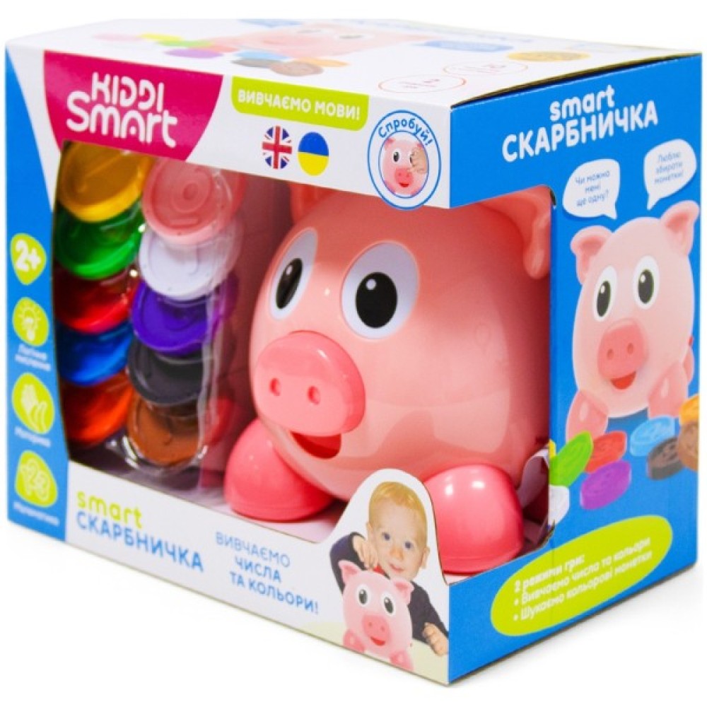 SMART-СКАРБНИЧКА – це інтерактивна двомовна іграшка, завдяки якій дитина вивчить числа та кольори українською та англійською мовами. А яскраві монетки зроблять гру ще цікавішою та веселішою! Нумо разом навчатися та гратися!
