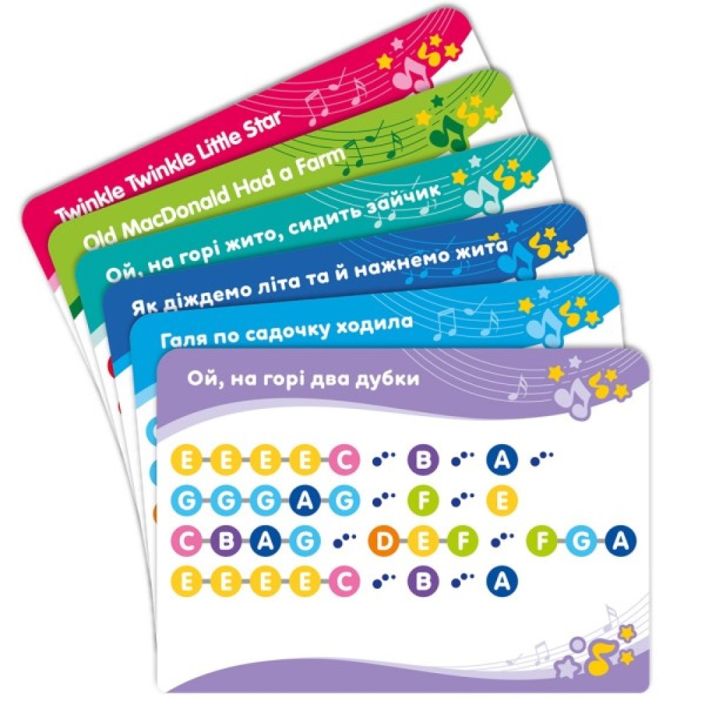• 12 нотних карток — з нотами українських та англійських пісеньок, які можна вставити у спеціальне заглиблення.