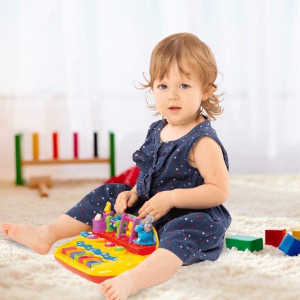 На ігровій панелі розміщені фігурки тварин, які весело рухаються, коли малюк грає на піаніно або слухає пісеньки чи мелодії.