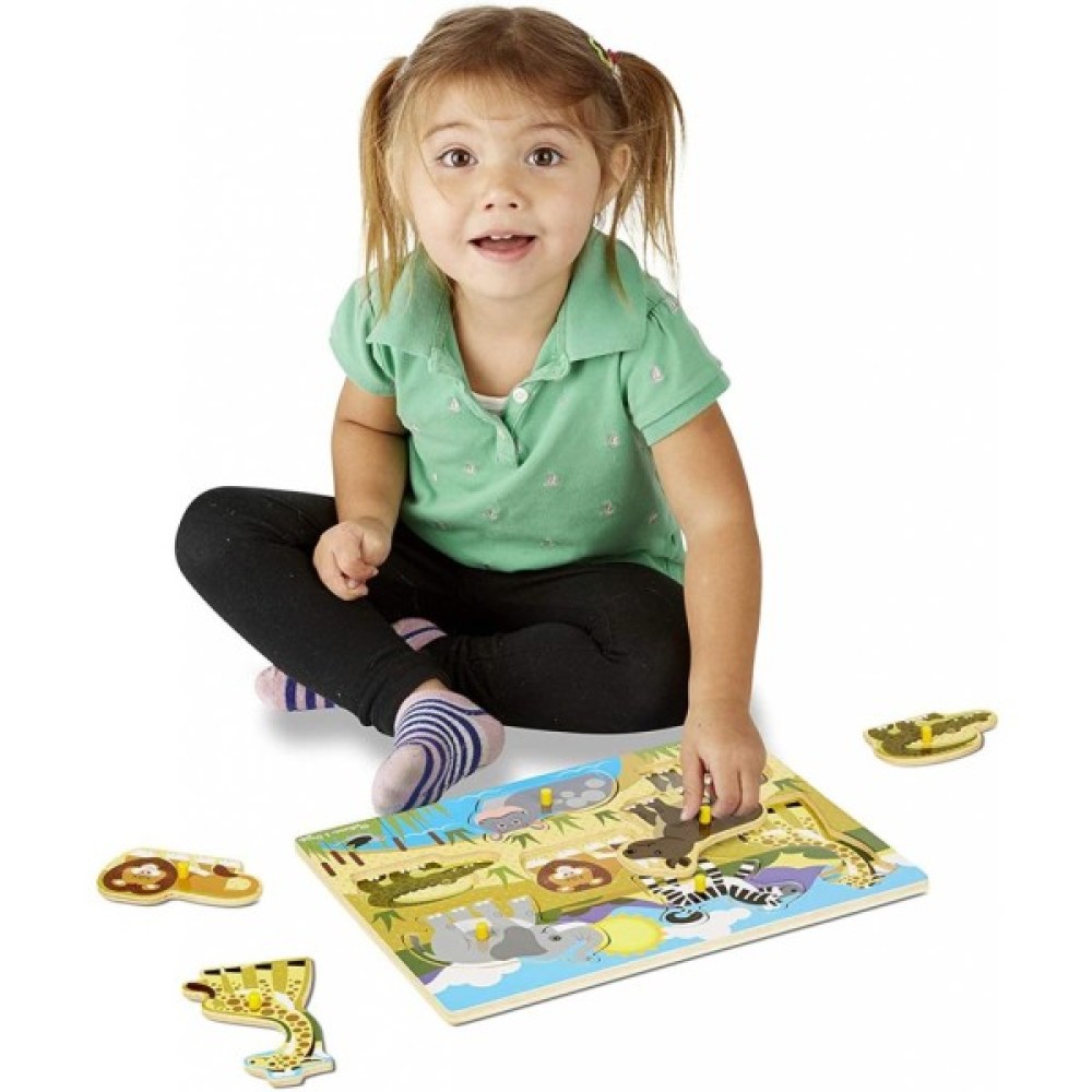 Ця дерев'яна рамка - вкладиш включає в себе сім африканських тварин, кожна фігура має спеціальну ручку, ручки знімних частин іграшки призначені полегшити збір пазла і розвинути моторику ручок, сама головоломка сприяє розвитку логічного мислення.