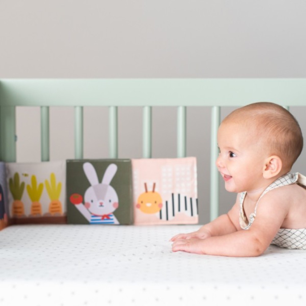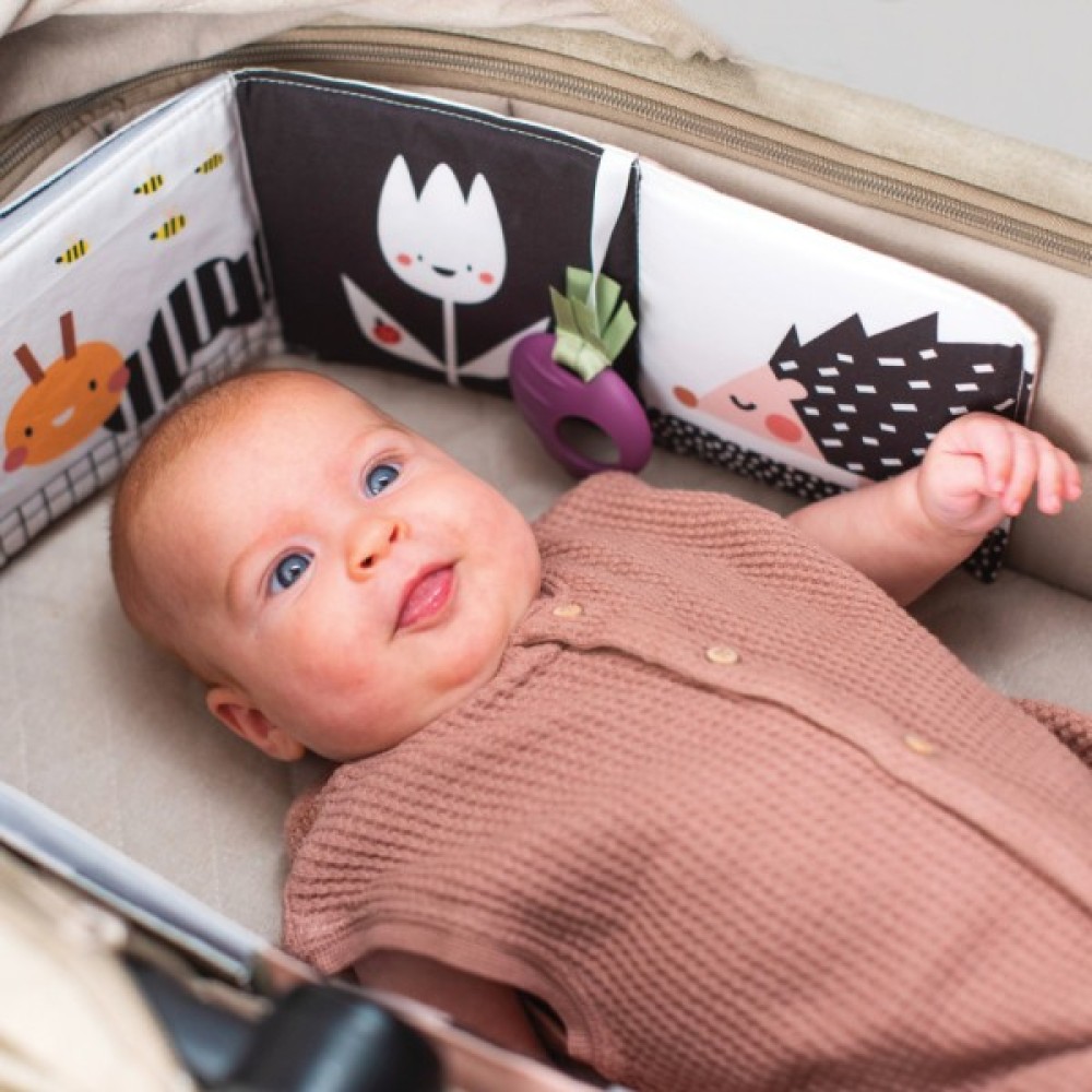 - На другій стороні - веселі барвисті картинки з елементами, що розвивають, - деталями, що шарудять, сенсорними текстурами тканин і безпечним дзеркалом.