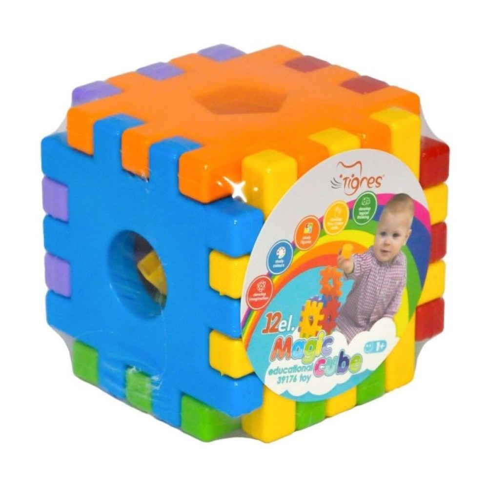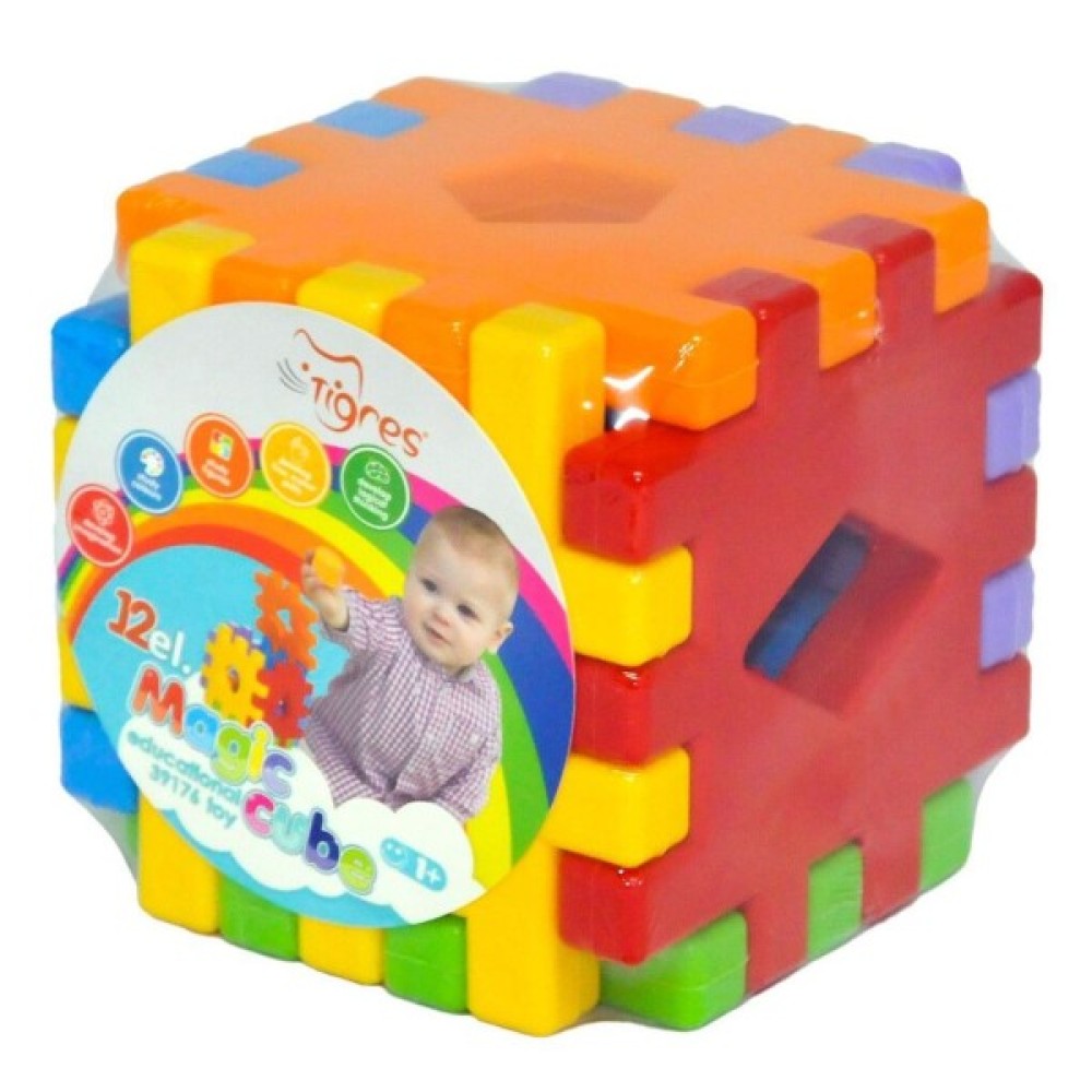 Розвивальна іграшка Чарівний куб 12 елементів — яскравий, захопливий і дуже корисний подарунок для дитини, який поєднує в собі функції конструктора та сортера.