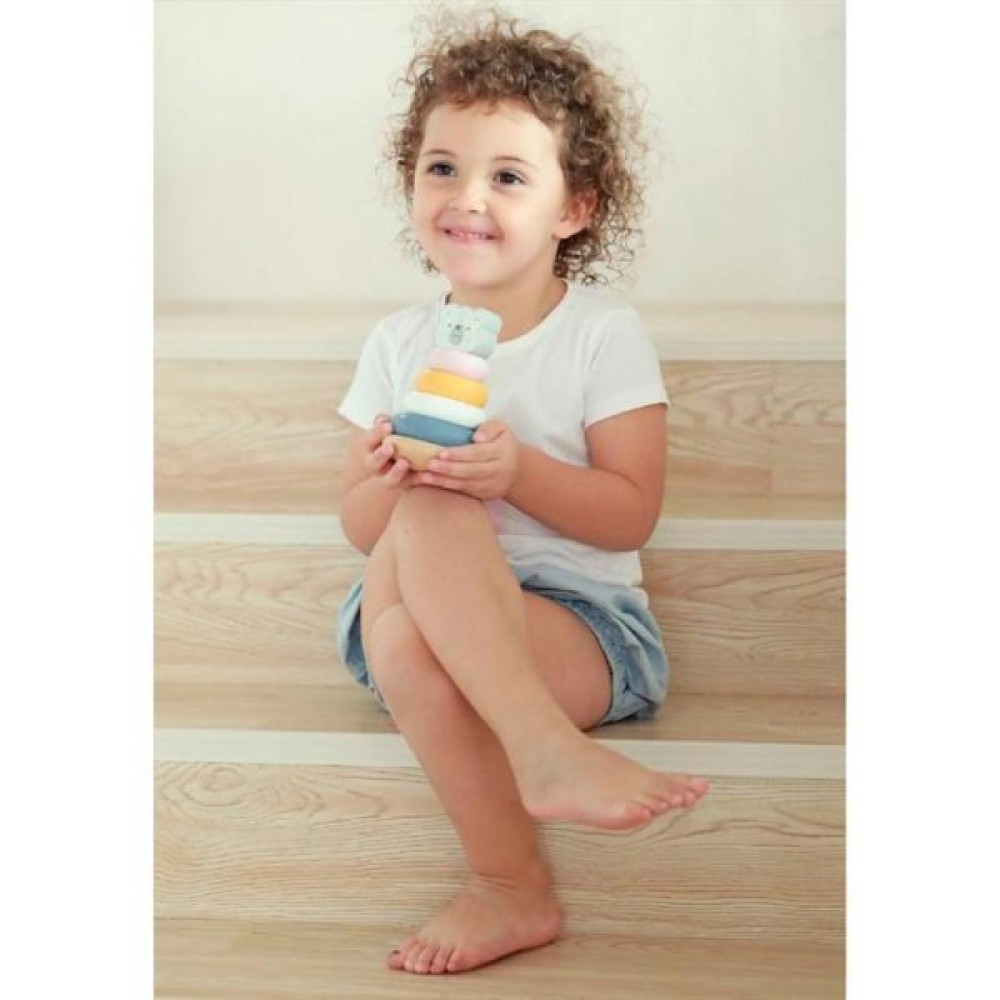 Усі елементи великі, гладкі, приємні на дотик. Завдяки закругленій дерев’яній підставці пірамідка-неваляшка PolarB Білий ведмідь може гойдатися з боку в бік.