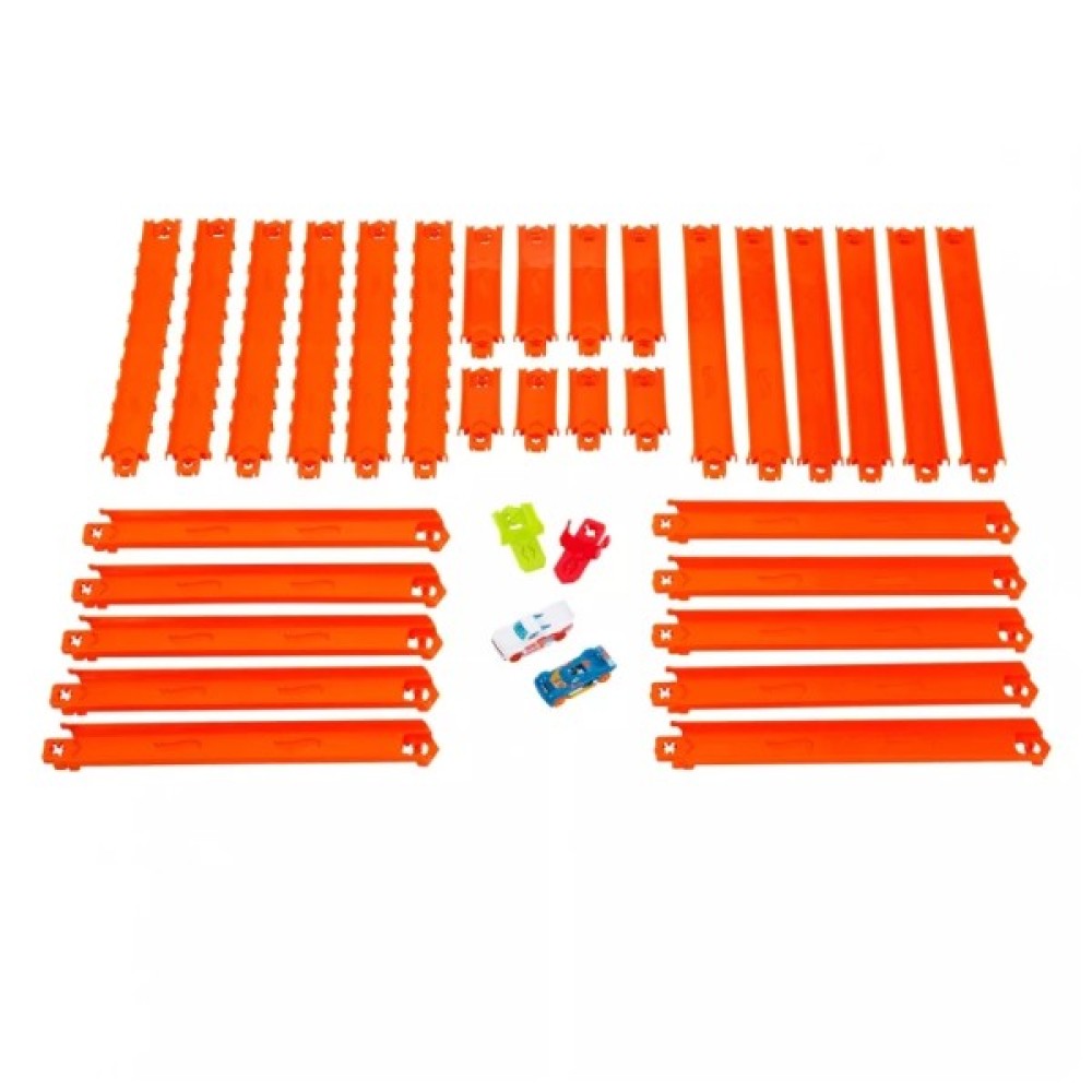 Почніть неймовірне будівництво або удоскональте наявні треки за допомогою великого набору доріжок Hot Wheels серії Track Creator з технологією кріплення Speed Snap! Набір містить 16 прямих доріжок для треку (по 30 см), 6 гнучких доріжок (по 30 см), 4 прямі доріжки (по 15 см), 4 прямі доріжки (по 7.5 см), 2 машинки та 2 адаптери для з’єднання з іншим типом кріплення доріжок Hot Wheels. Використовуйте оригінальні помаранчеві доріжки з технологією кріплення Speed Snap, аби розширити межі можливостей своїх треків.
