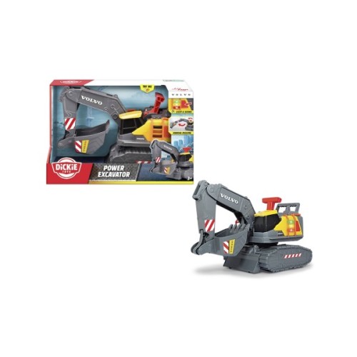 Автомодель Dickie Toys Екскаватор Вольво Будівельна сила має стильний сіро-жовтий дизайн із червоно-білими сигнальними елементами, широкі гусениці та інтуїтивно зрозуміле ручне керування.