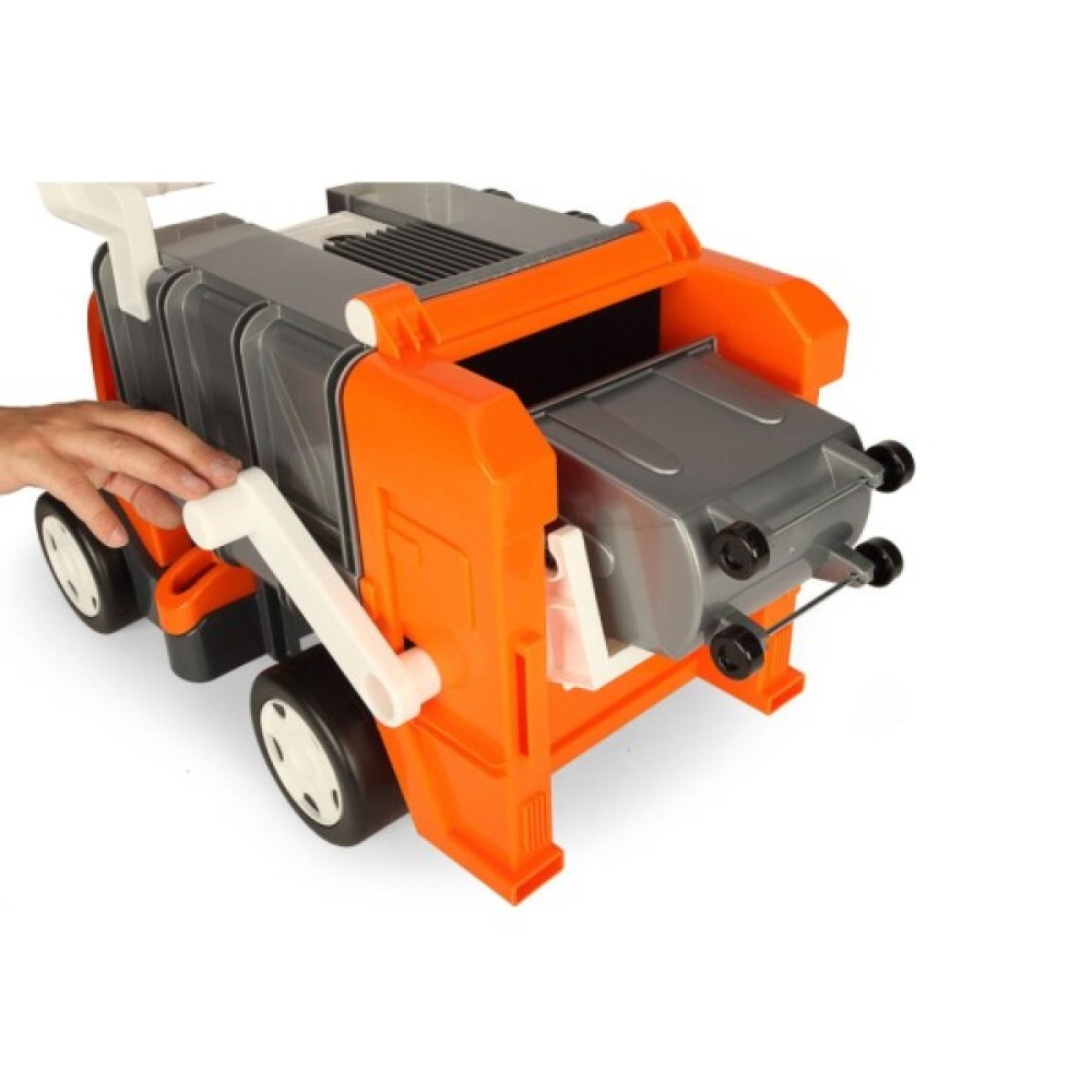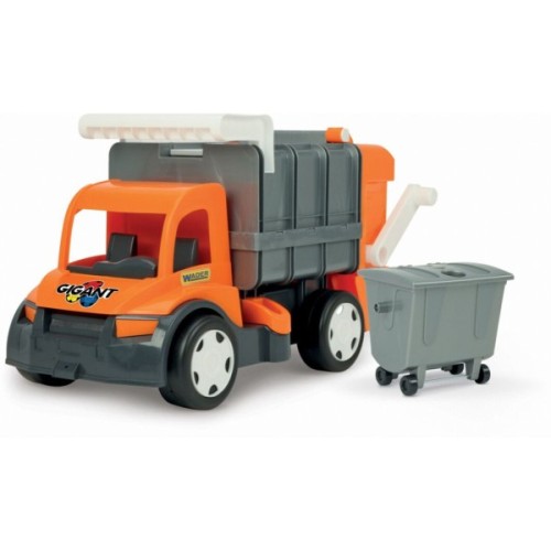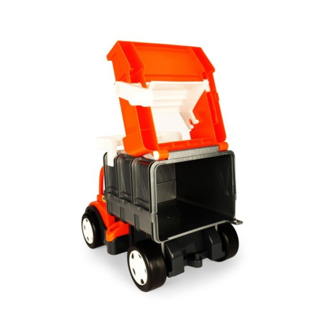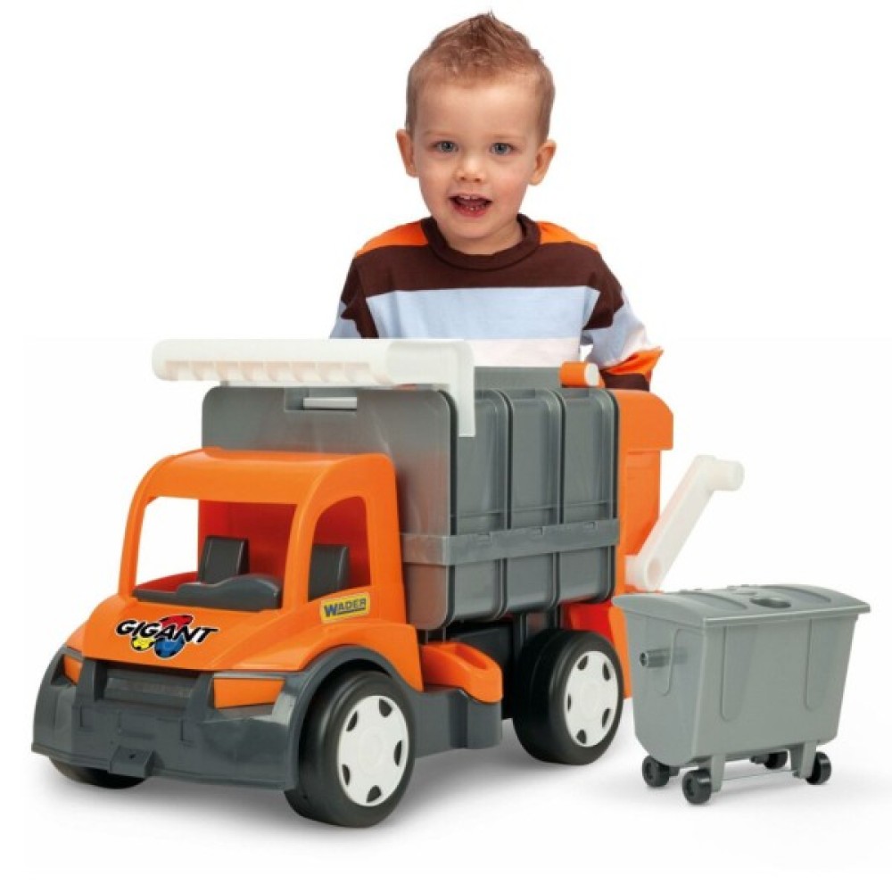 Сміттєвоз Гігант - це велика, міцна машина довжиною 65 см. У комплект із сміттєвозом входить також сміттєвий бак з відкидною кришкою. Бак встановлюється на спеціальну підніжку позаду машини і за допомогою підйомника, його вміст перекидається усередину вантажного бака через кришку, яка відкривається. Рухомі елементи, міцна конструкція, велика вантажопідйомність роблять іграшку надзвичайно цікавою для кожного малюка. Всі елементи виготовлені із високоякісного нетоксичного матеріалу, стійкого до погодних умов, завдяки чому машиною можна гратись цілий рік як вдома так і у дворі. Ігри сміттєвозом створюють додаткові можливості для рухової активності, підтримують моторний розвиток дитини, а також розвивають його уяву і креативність. Окрім цього іграшка вчить дітей дбати про чистоту навколишнього середовища.