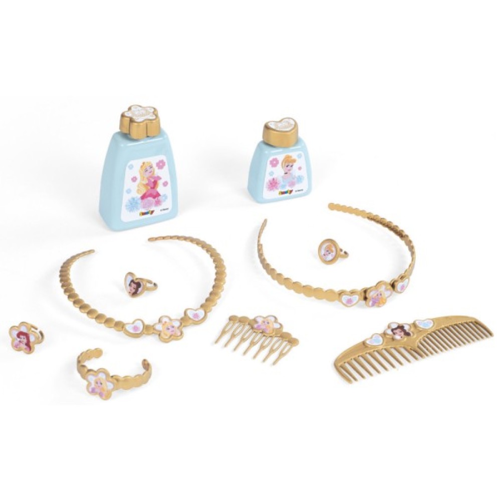 столик комплектується стільчиком і набором аксесуарів: 2 флакони, 2 гребінці для волосся, обруч для волосся, браслет, кольє і 3 кільця.