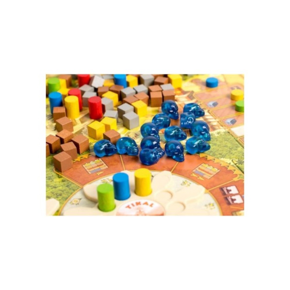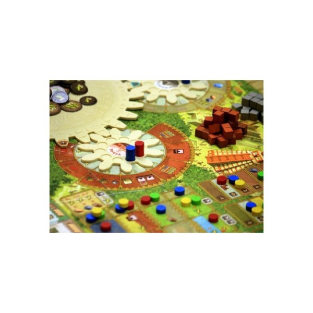 Комплектація 6 частин ігрового поля, 6 шестерень, 1 лист з наклейками, 6 фіксаторів, 24 робочих, 28 маркерів, 4 фішки, 65 кубиків ресурсів, 13 черепів, 65 жетонів кукурудзи, 28 плиток урожаю, 21 плитка початкового достатку, 13 жетонів монументів, 32 жетони будівель, 4 двосторонні планшети гравців, 1 маркер першого гравця, правила