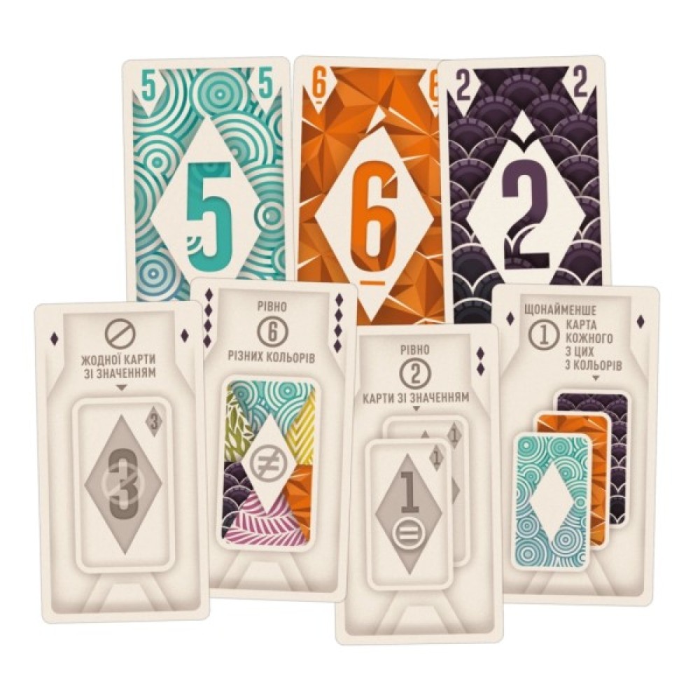 Комплектація 109 карт, 1 блокнот для підрахунку очок, правила