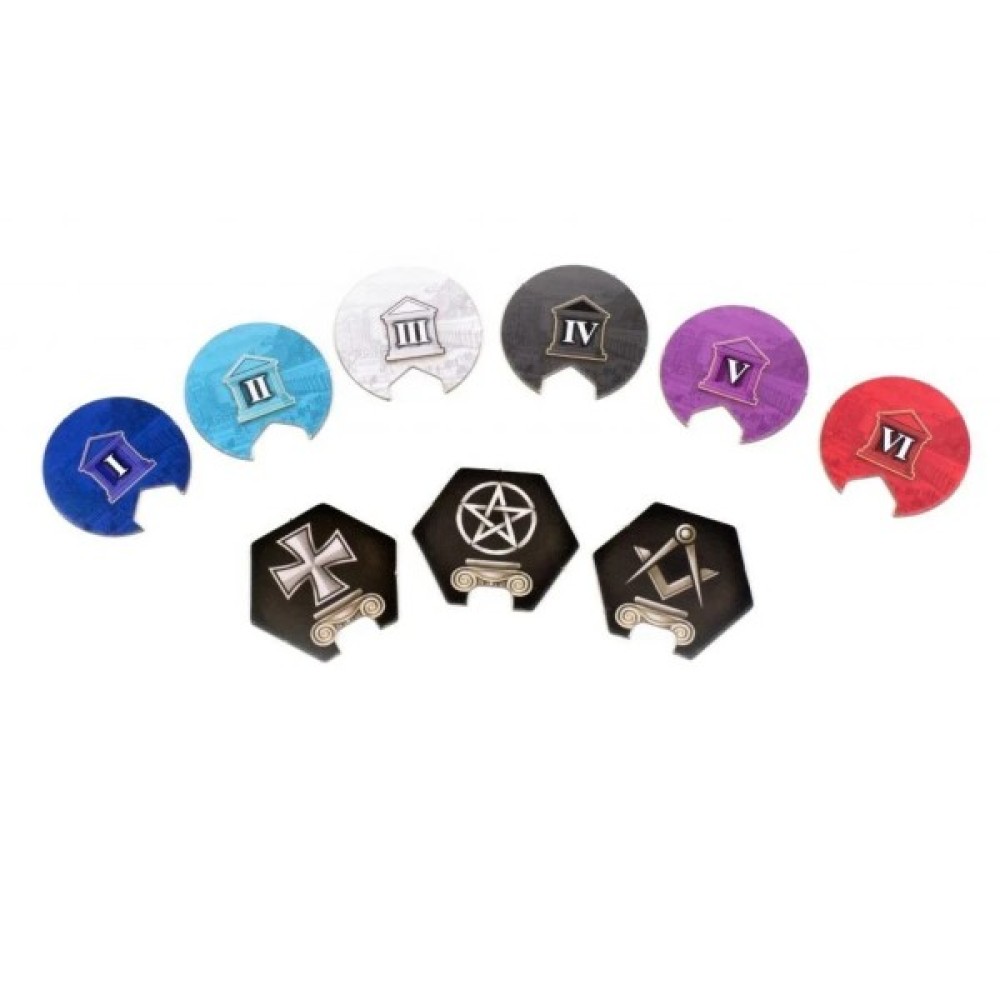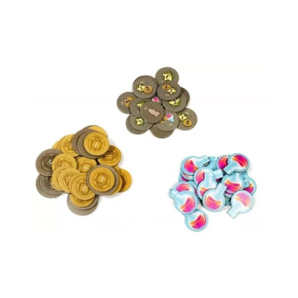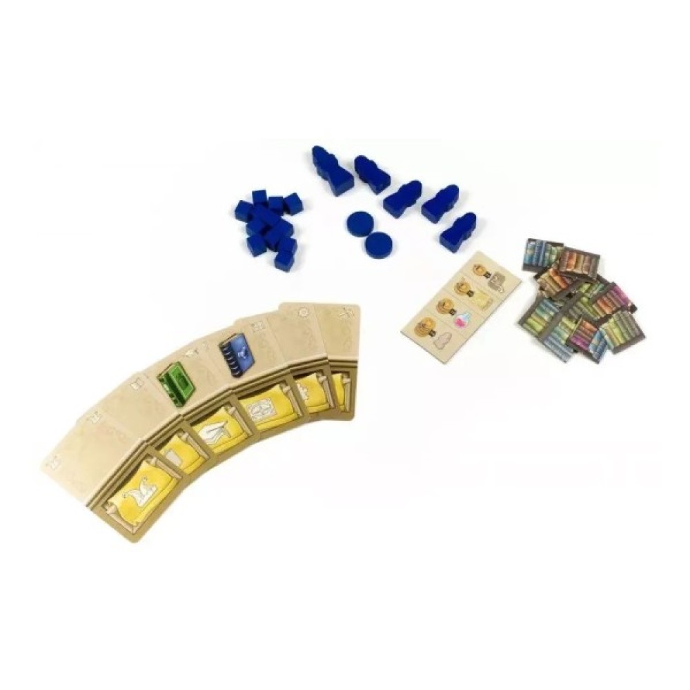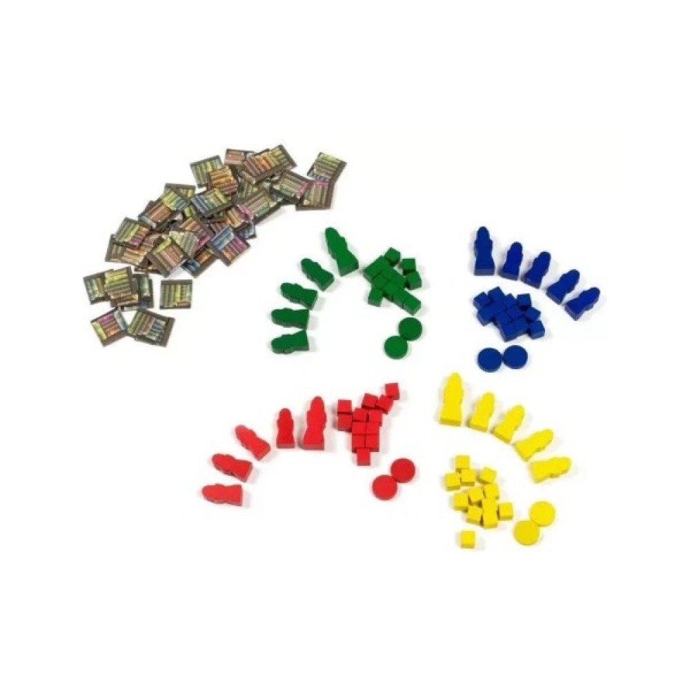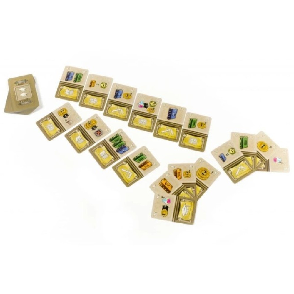 Комплектація 1 поле з картою Європи 1 поле треків 4 планшета вчених 10 жетонів цілей 10 жетонів спеціалізацій 12 жетонів надходжень 4 жетони медичних надходжень 18 жетонів бонусів 20 жетонів колб 48 жетонів книг (по 12 в 4 кольорах гравців) 3 жетона пам'ятників науки 32 монети (номіналів 1 і 5) 10 жетонів винаходів 20 жетонів розробок 7 жетонів міст 6 жетонів університетів 20 карт геніїв 24 стартові карти дій (по 6 в 4 кольорах гравців) 45 карт дій (по 15 в 4 кольорах гравців) 4 жетони-підказки 16 фішок студ