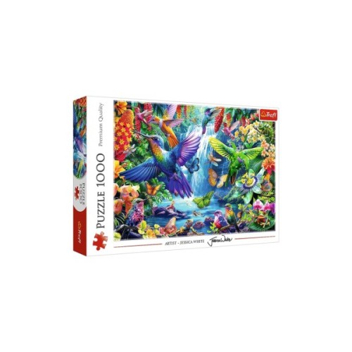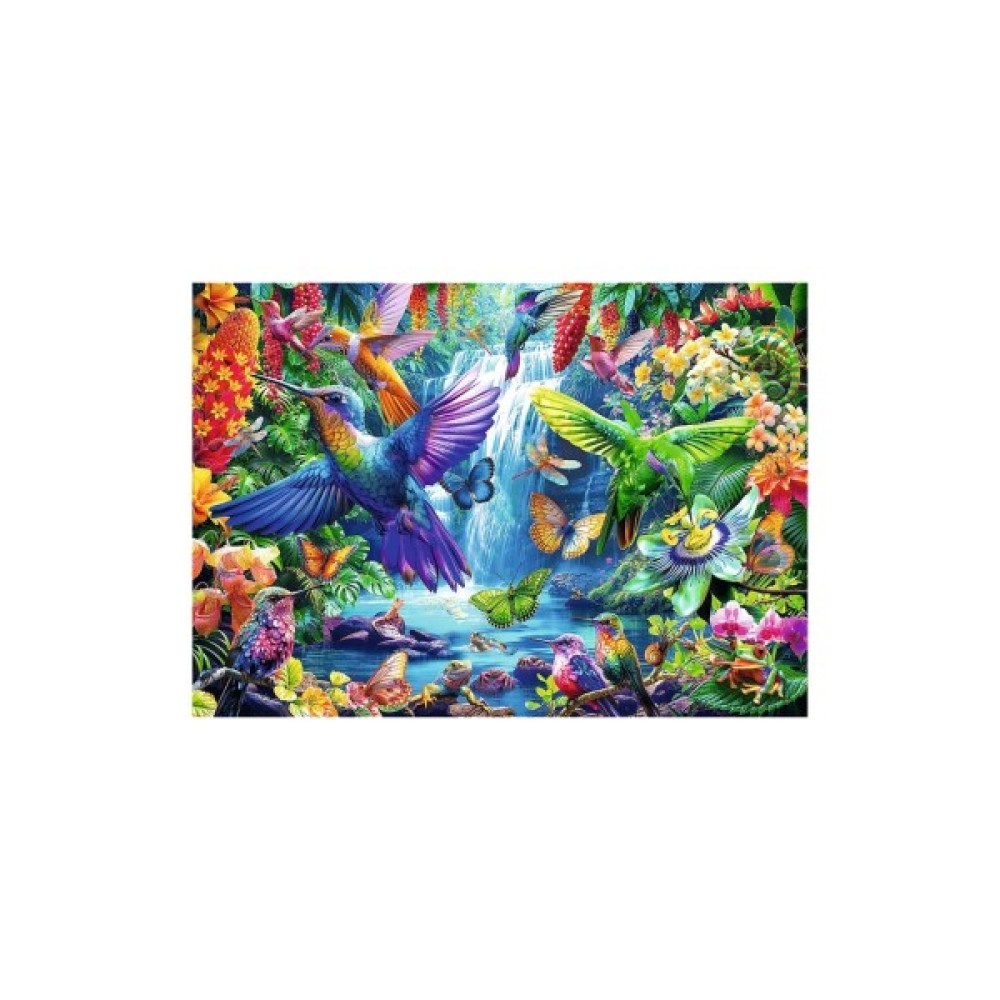 Пазли на 1000 елементів з різнокольоровими колібрами та метеликами в оточенні тропічних рослин та водоспаду, зображеними на мальовничій картині відомої сучасної австралійської цифрової художниці Джесіки Уайт "Колібрі у тропіках".