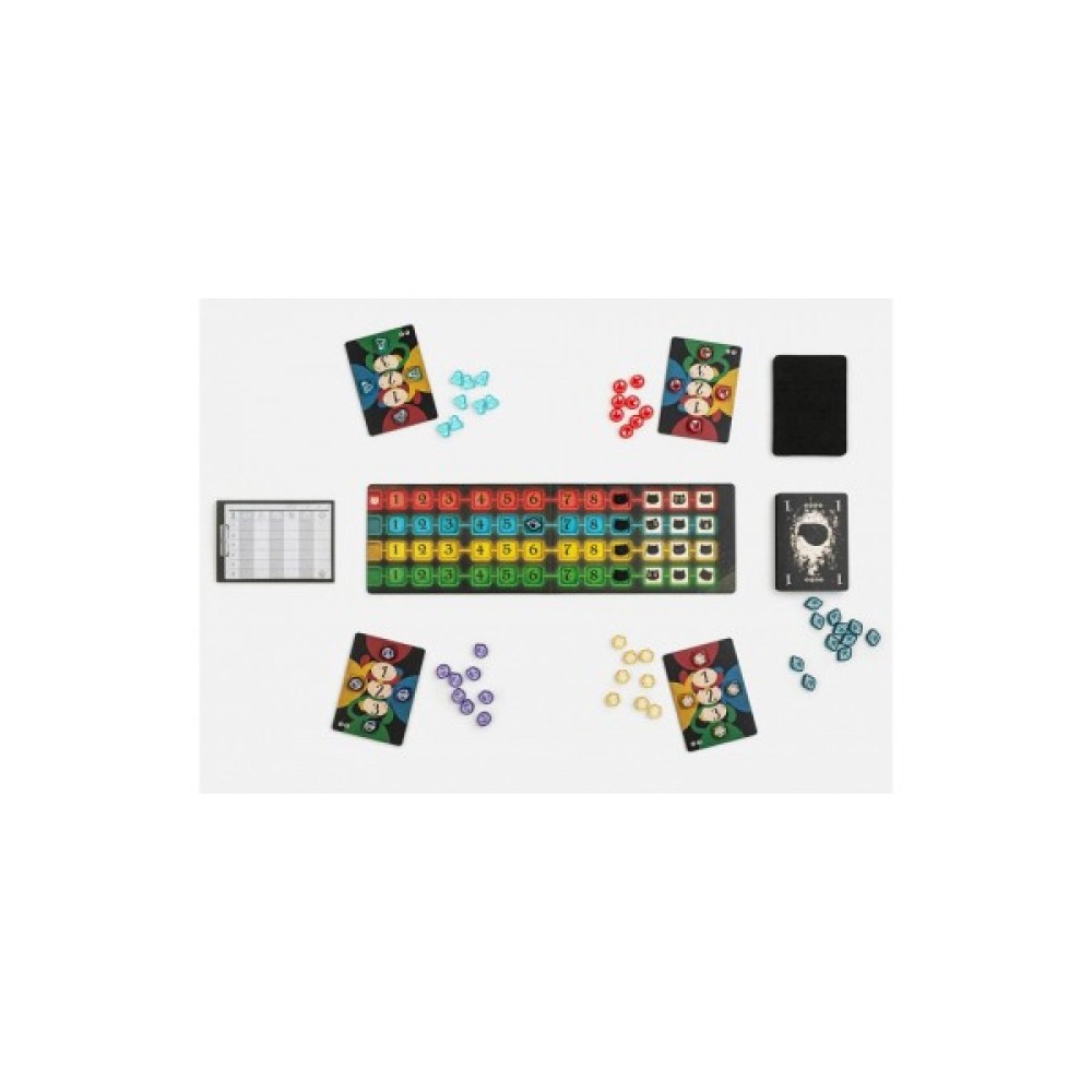 50 карток; 1 поле дослідження; 5 планшетів гравців; 64 жетони; 1 бланк результатів; 1 книга правил