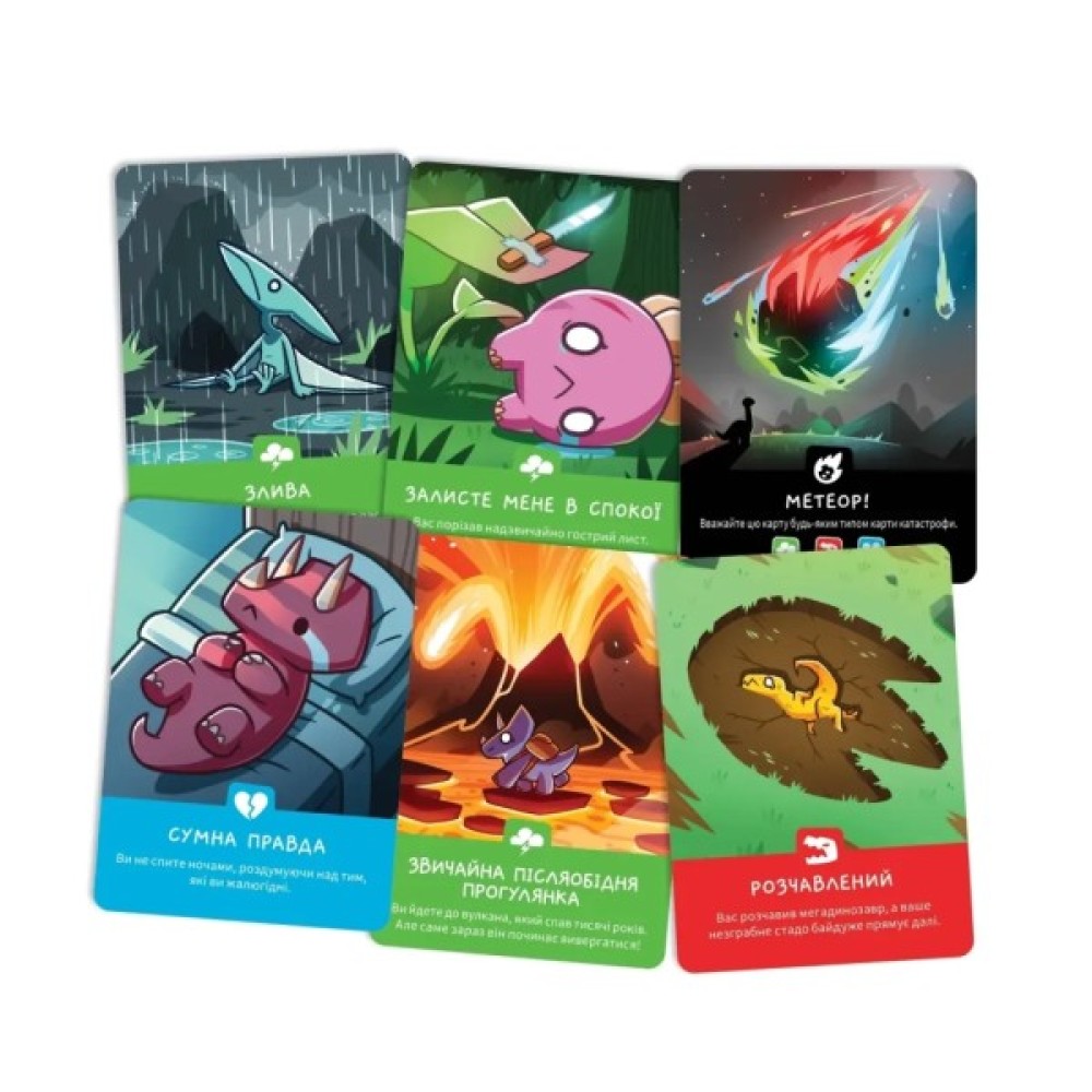 В комплекті — 97 карт, 4 фігурки та планшети динозаврів, які доповнюють захоплюючий процес гри. Завдання гравців полягає в тому, щоб обережно просуватися шляхом втечі від катастроф, накопичуючи очки та уникаючи зон небезпеки. Є два способи перемоги: першим здобути 50 очок або ж залишитися останнім уцілілим динозавром.