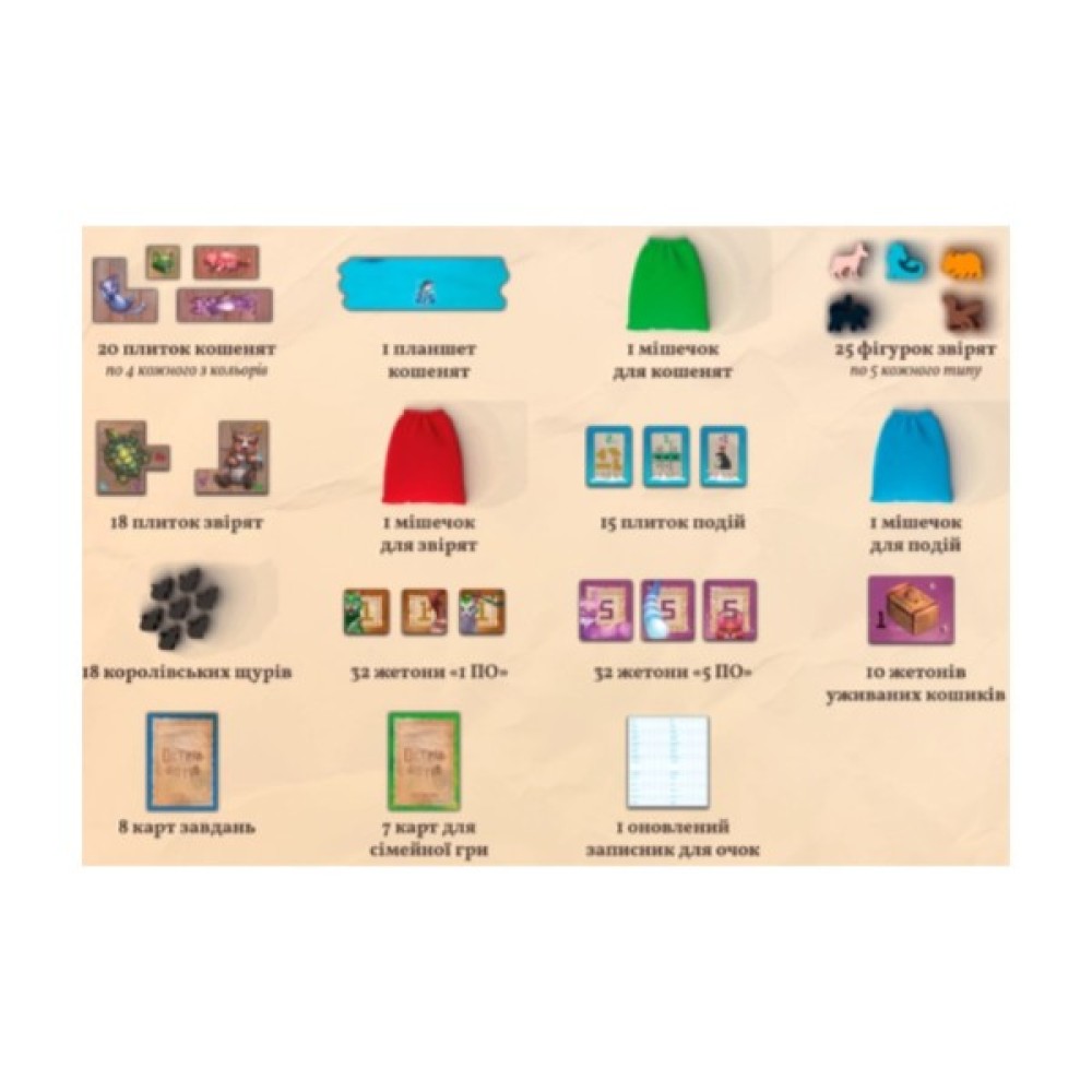 25 фігурок звірят (по 5 кожного типу) 18 дерев’яних щурів 20 плиток кошенят (по 4 кожного кольору) 18 плиток звірят 15 плиток подій 1 модуль завдань (8 карт завдань) 7 карт для сімейної гри 3 мішечки (1 для звірят, 1 для кошенят і 1 для подій) 10 жетонів уживаних кошиків 64 жетони очок (32 x «1 ПО», 32 x «5 ПО») 2 книжечки правил (звичайна гра й сімейна гра) 1 записник для очок