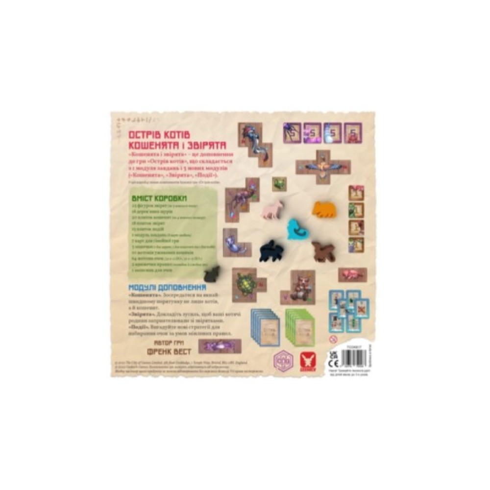 Комплектація з 25 фігурок звірят, 18 дерев'яних щурів, 20 плиток кошенят та багато іншого гарантує, що кожна партія буде неповторною. Гра підходить для компанії від 1 до 6 осіб, що робить її чудовим вибором для родинних вечорів чи зібрань з друзями. Завдяки українській мові правил, вона буде зрозумілою та доступною для кожного. Відмінний вибір для дозвілля, починаючи від 8 років!