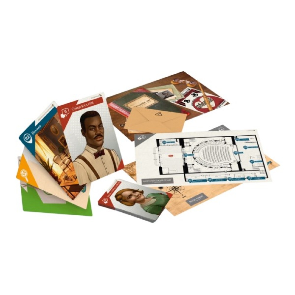 Комплектація 167 великих карт, 3 листи передмов до справ, 6 карт та документів, 3 конверти з розв'язками, 1 правило гри