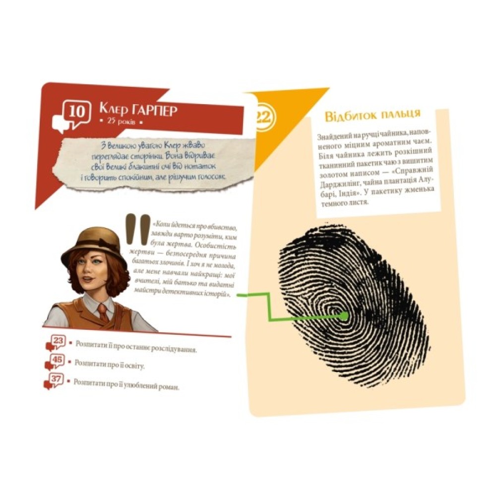 У цьому комплекті ви знайдете 167 великих карт, які відкриють перед вами цілий світ загадок, а конверти з розв'язками гарантують захопливі розв'язки. Ви разом з Клер Гарпер – першою жінкою-випускницею Оксфорда 1927 року – вирушите у пригоди від розкішних садиб до тіньових театрів, з екзотичної Шотландії до величного Єгипту.