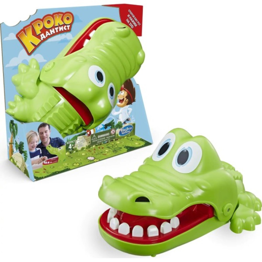 Гра розрахована на 2-4 гравців, тому запрошуйте друзів для ще більшого задоволення. Виграє той, у кого крокодил не "покусав". Комплектація передбачає міцний ігровий блок крокодила, що не викликає труднощів у використанні, та детальні інструкції. Насолоджуйтесь чарівними моментами сімейного відпочинку з настільною грою Hasbro Кроко Дантист!