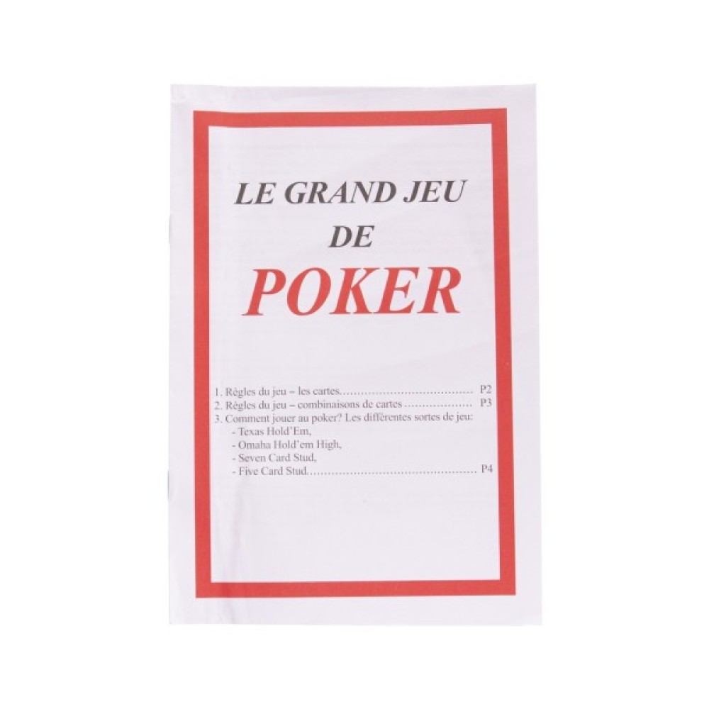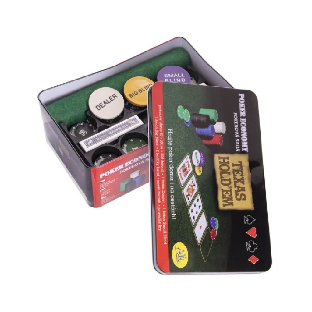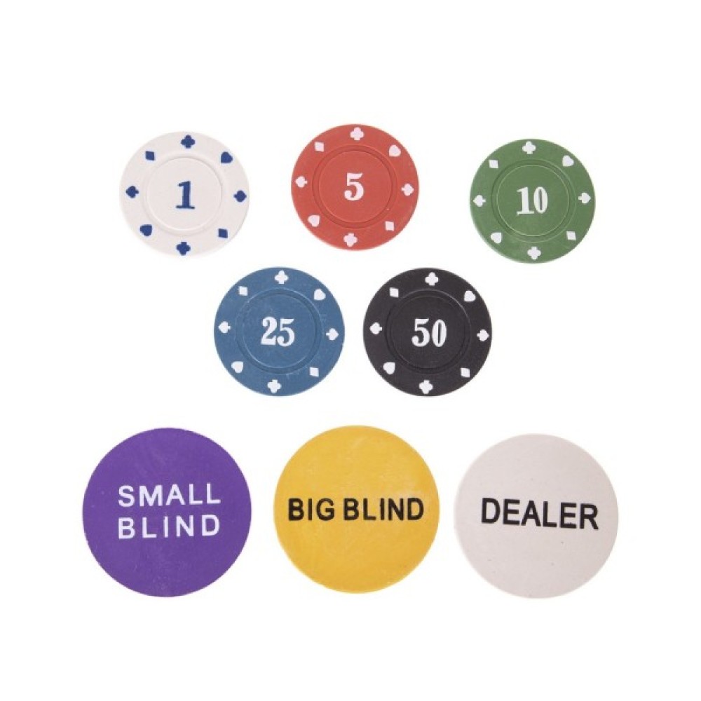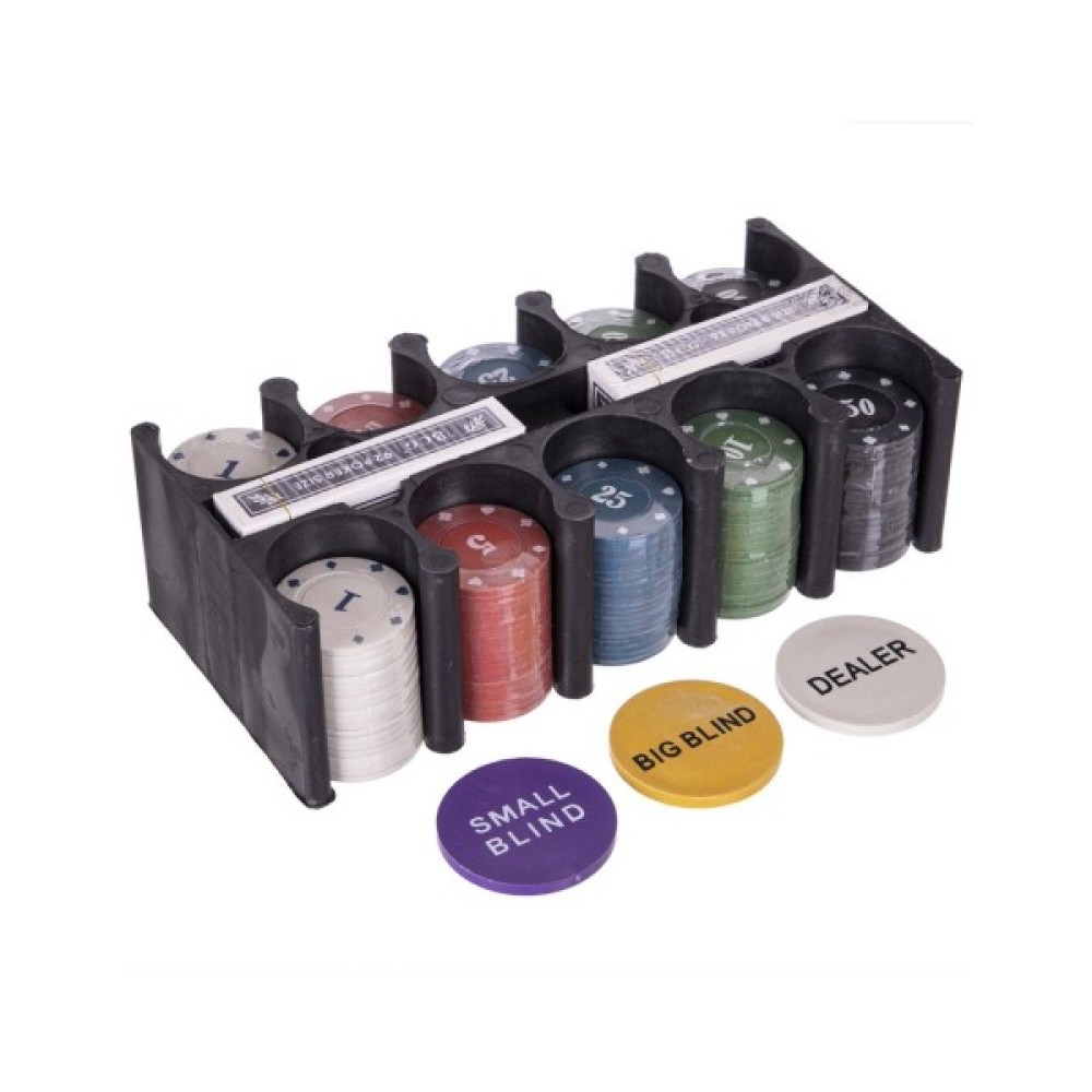 Комплектація 200 фішок, 2 колоди карт по 54 шт., 1 кнопка дилера (38 мм), 2 фішки Великий і Малий Блайнд, 1 зелене синтетичне сукно 90 x 60 см, 1 бляшана коробка для зберігання