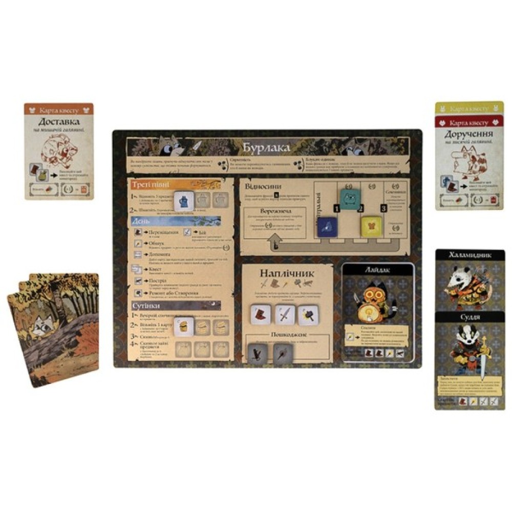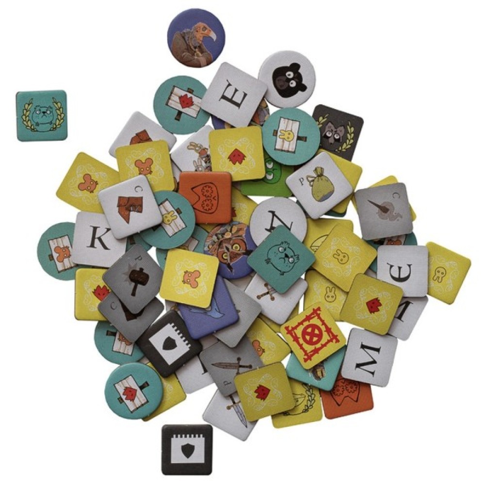 Комплектація 4 планшети фракцій, 9 карт, 41 дерев'яний воїн, 65 жетонів, 3 маркери послуг, підставка для карт, правила гри