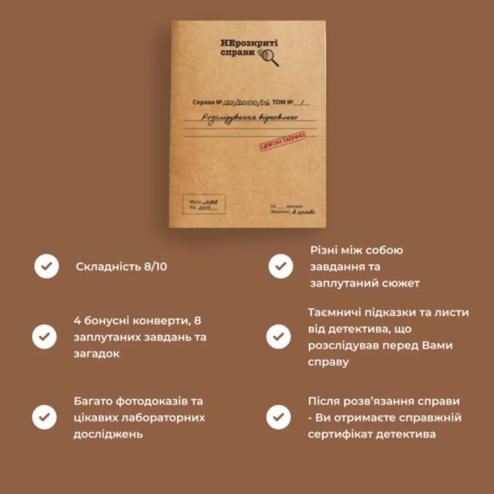 Комплектація 55+ докуменів слідства, 4 бонусні конверти, 8 заплутаних завдань та загадок