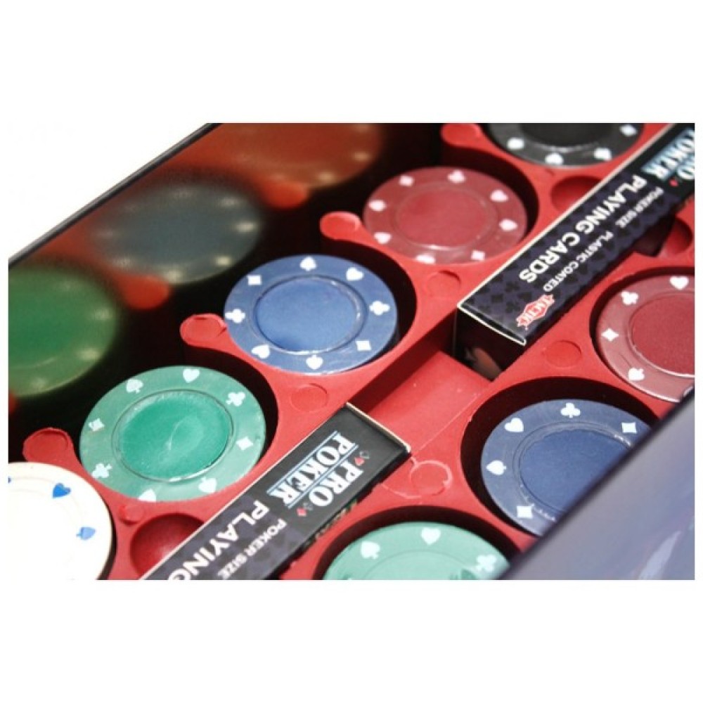 У комплект входять дві колоди гральних карт для різноманітності етапів гри, а спеціалізовані фішки дилера, великого та малого блайнда, перетворять вас на справжнього професіонала. Зручний лоток для фішок утримує їх організовано, щоб вся увага була приділена найважливішому — стратегії і емоціям.