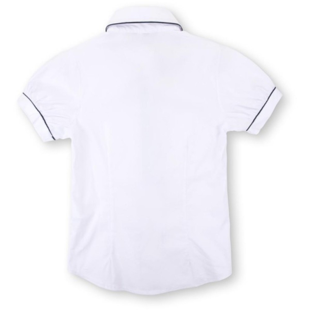Класична блузка приталеного силуету з тонкого еластичного стрейчевого матеріалу. Короткі рукава, призібрані по низу, закінчуються неширокими манжетами. Застібається на металеві ґудзики з перламутровими вставками. По застібці-планці, відкладному коміру та на рукавах, вставлений темно-синій тонкий кант. Лінія низу скруглена.