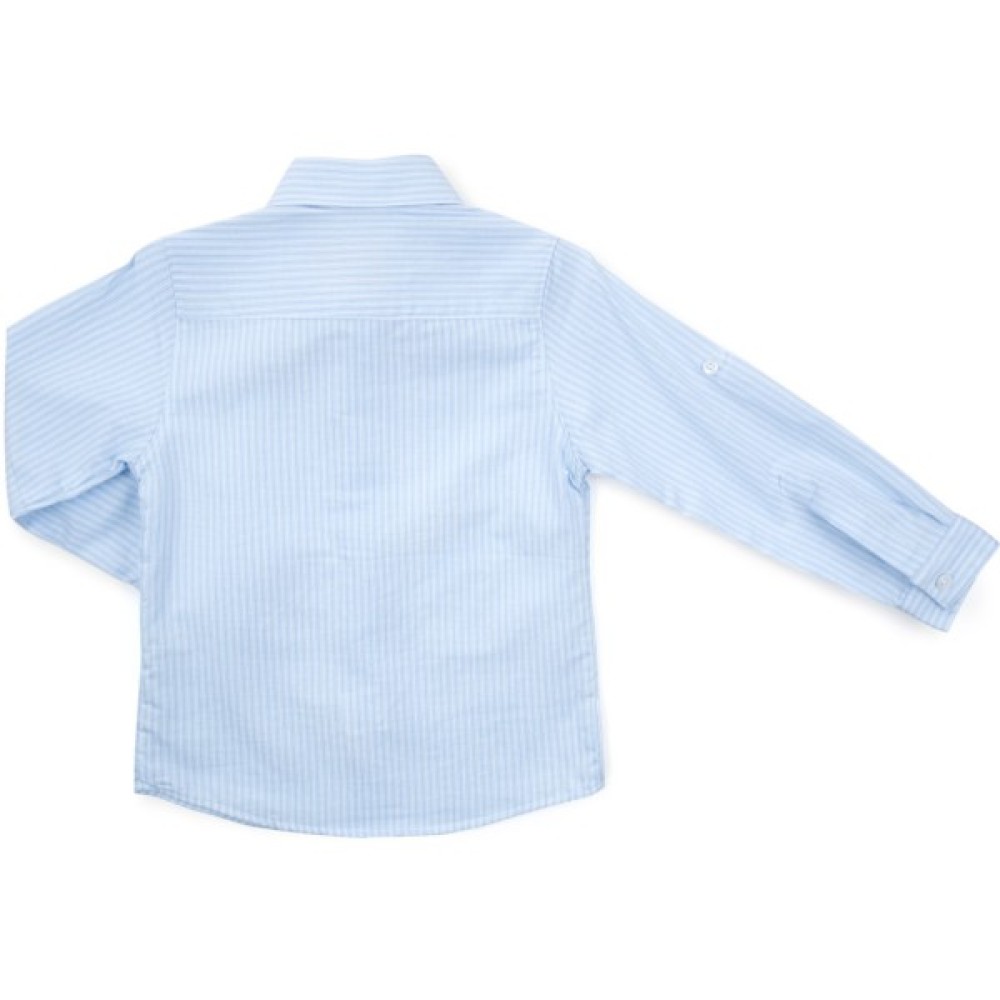Класична сорочка з натуральної бавовни для хлопчика в тонку біло-блакитну смужку з довгими рукавами на манжетах. Тканина м'яка, дуже приємна на дотик. На грудях, з лівого боку, невеликий вишитий фірмовий логотип «B». Низ трохи закруглений. Класичний відкладний комір, застібка-планка, спереду по-центру, і манжети на рукавах застібаються на фірмові перламутрові ґудзики. Рукава можна закочувати і фіксувати хлястиками і гудзиками.