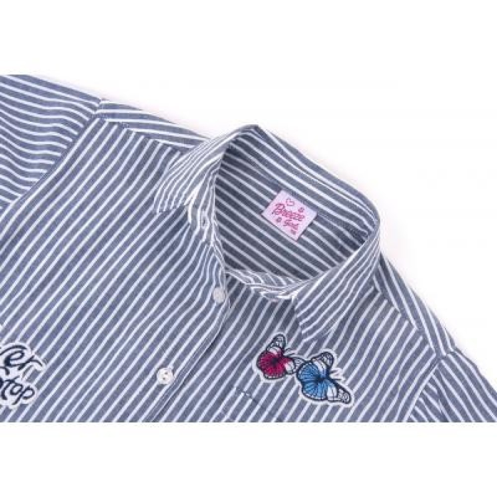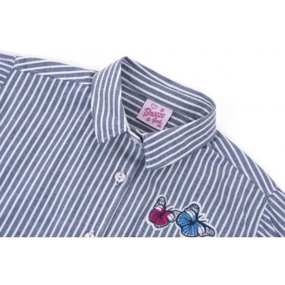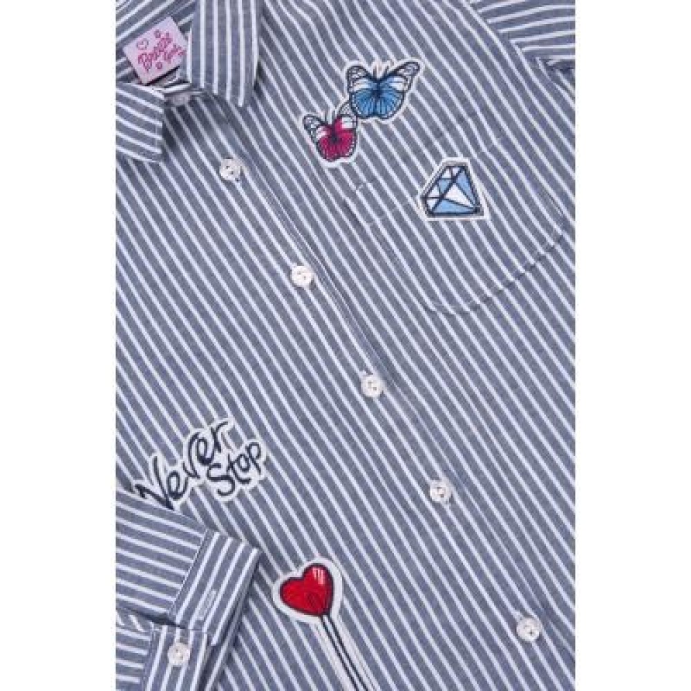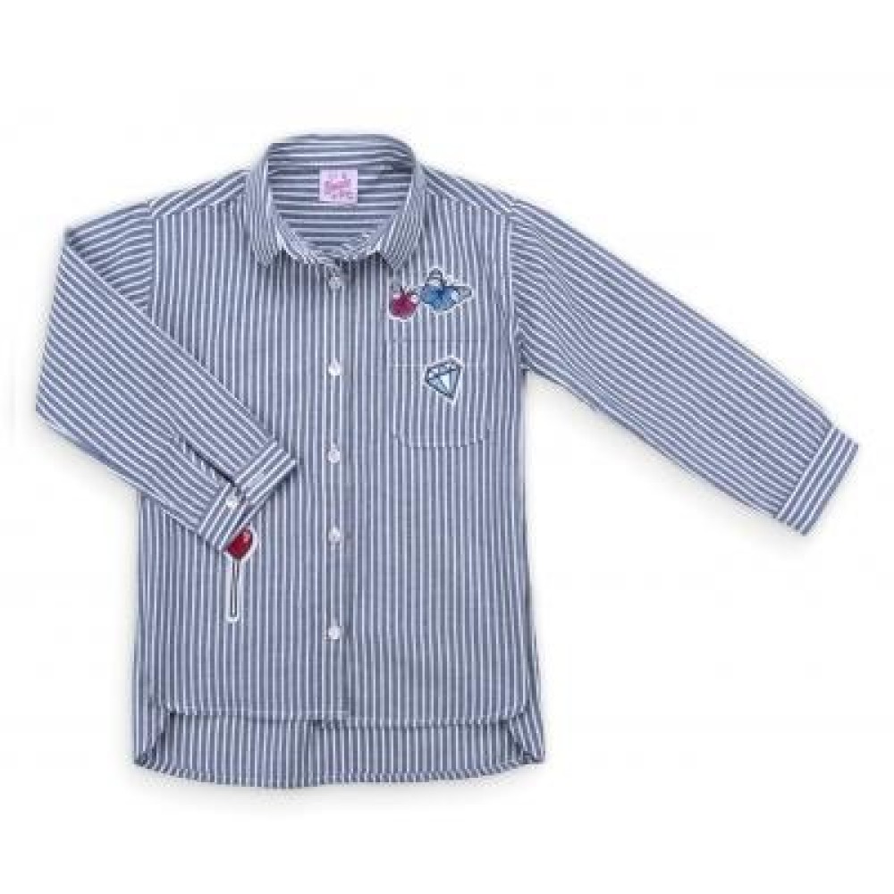 Модна смугаста сорочка класичного вільного, прямого крою з тонкої натуральної бавовни для дівчинки (Не тягнеться!). На грудях, з лівого боку, накладна кишеня. Прикрашена класними, милими та яскравими вишивками-аплікаціями. Низ закруглений, по спинці довше, ніж спереду. Класичний відкладний комір, застібка-планка, спереду по-центру, і манжети на рукавах застібаються на білі фірмові перламутрові ґудзики.