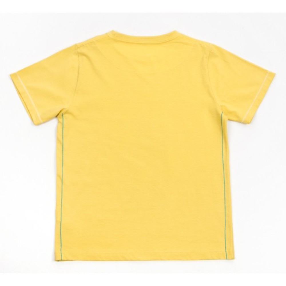 - Легка трикотажна футболочка з коротким рукавом, приємного насичено-жовтого кольору, прикрашена спереду об'ємним принтовим малюнком та написами, по бокам кольоровими оздоблювальними рядками - відмінний літній варіант для вашої дитини.