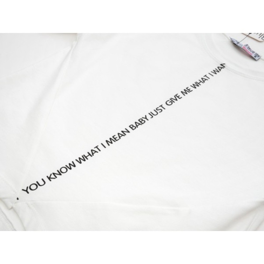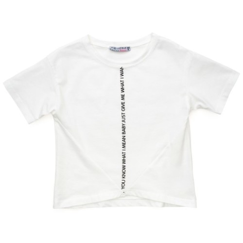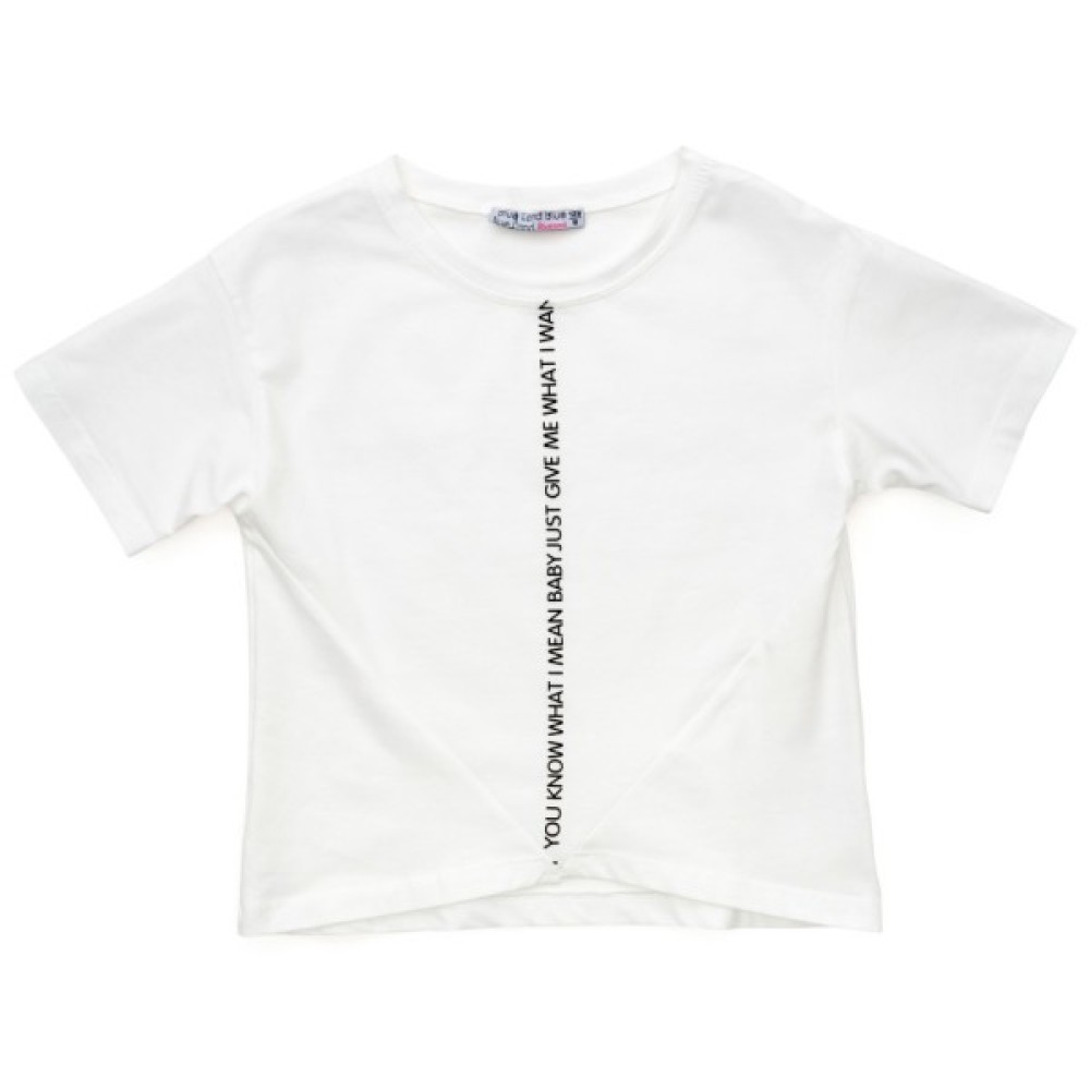 Лаконічна футболка кремового кольору, прикрашена на грудях ефектним вертикальним принтовим написом.