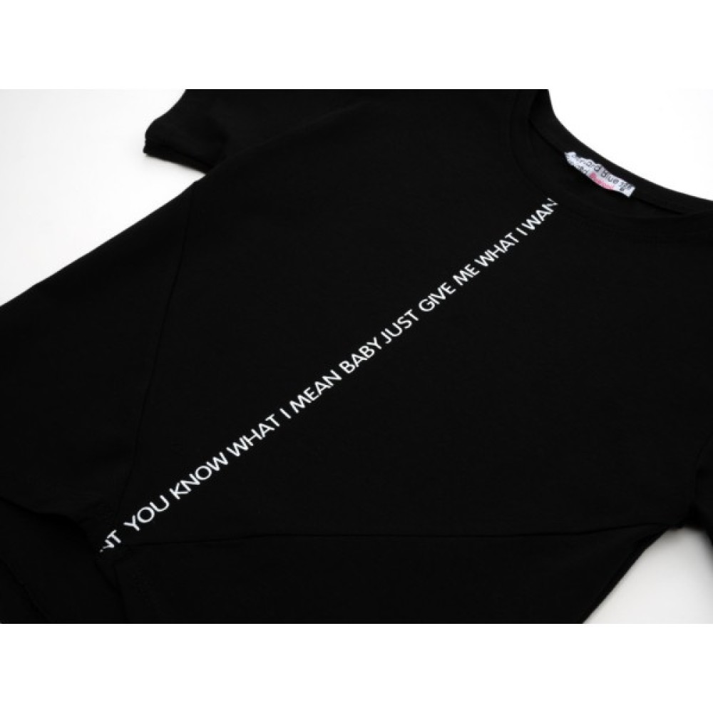 Лаконічна футболка чорного кольору, прикрашена на грудях ефектним вертикальним принтовим написом.