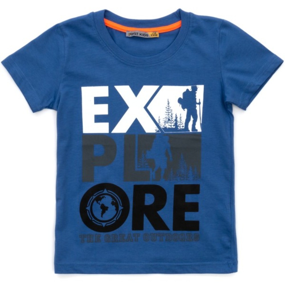 Ефектна трикотажна футболка кольору «індіго», прикрашена об'ємним принтовим малюнком слова «EXPLORE» та фігурами мандрівників.