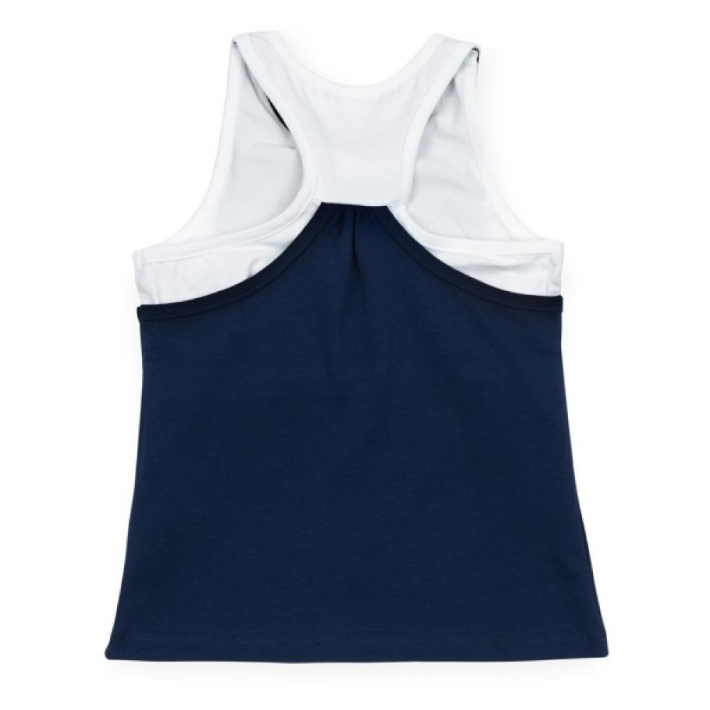 Стильна, дуже ефектна, двокольорова трикотажна приталена модель, прикрашена яскравим білосніжним принтом зі сріблястими глітерними деталями. Верх майки двох ярусний - біла внутрішня деталь-обманка довжиною дорівнює довжині топа, виступає по проймах. Пройма і горловина оброблені м'якою трикотажною бейкою.