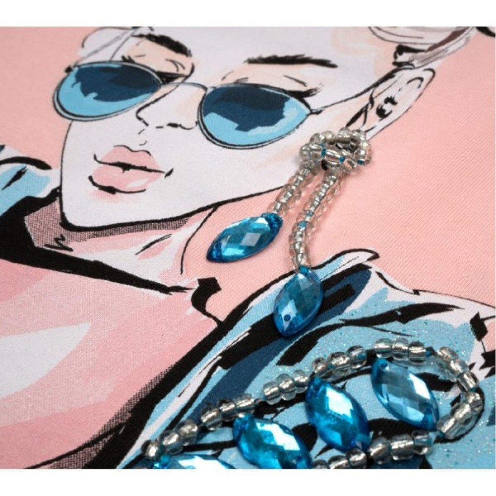 Футболочка прикрашена ефектним принтом з глітерними деталями, пришитим великим бісером і блискучими блакитними кристалами.