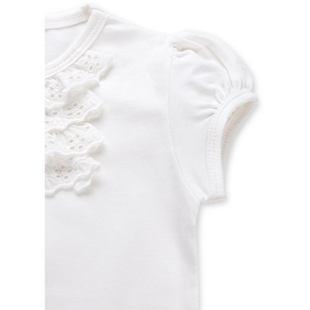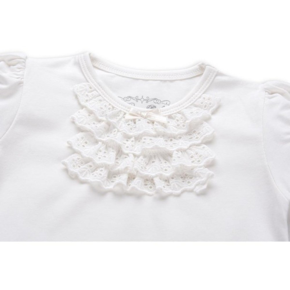 Симпатична модель, приємна на дотик, спереду прикрашена класними, настроченими в чотири ряди, мереживними рюшами в тон футболці (мереживо-шиття) і милим атласним бантиком по центру горловини. Короткий рукав-ліхтарик, призборений по окату і низу, надає цій моделі милий вигляд. Еластична кругла горловина, оформлена ніжною трикотажною бейкою, м'який трикотаж і застібка на перламутрові фірмові ґудзики на лівому плечі, полегшать процес одягання. Для додаткового оздоблення моделі, в лівому нижньому кутку пришитий золотистий логотип фірми «BREEZE» в оточенні кристаликів.